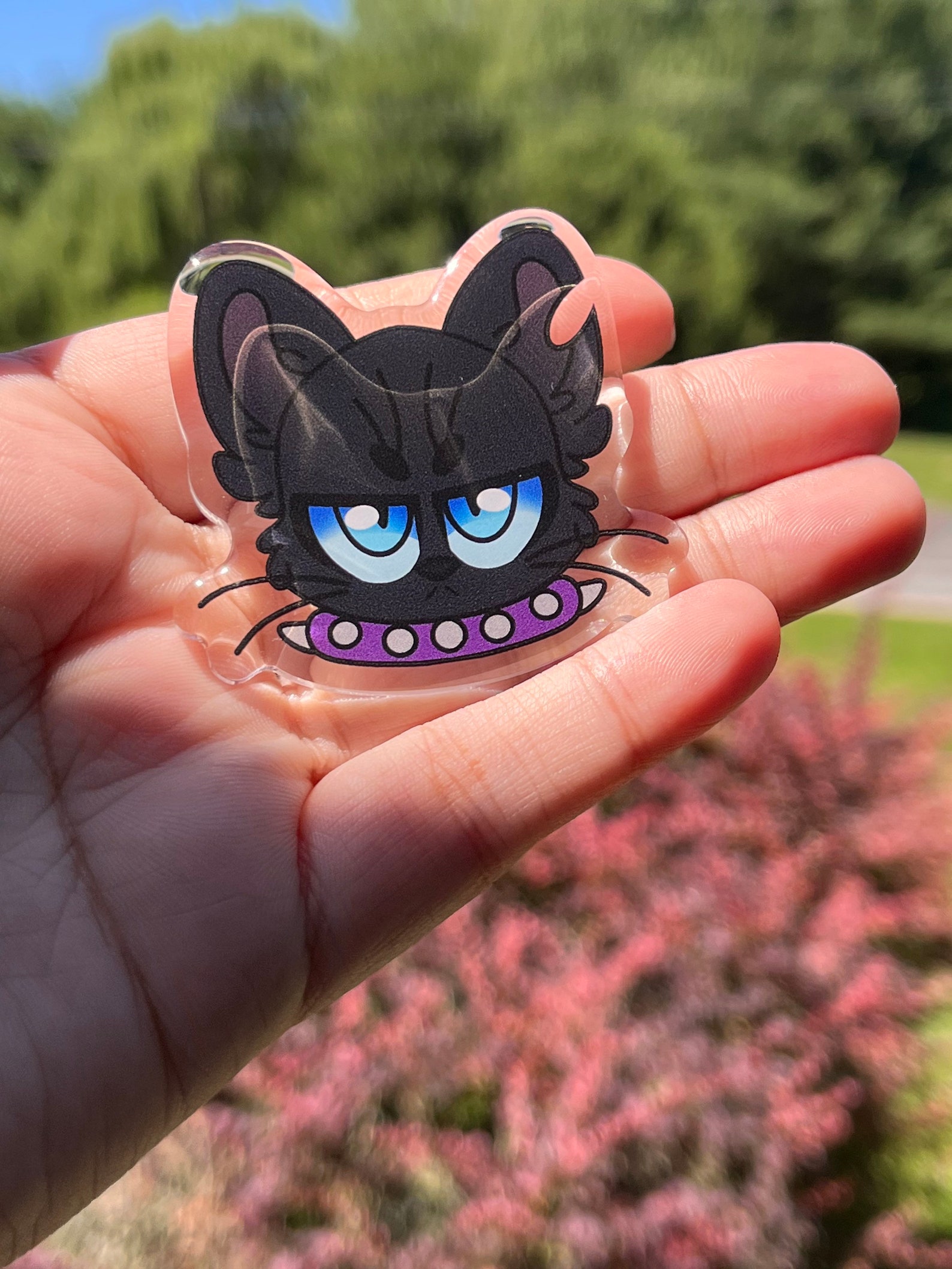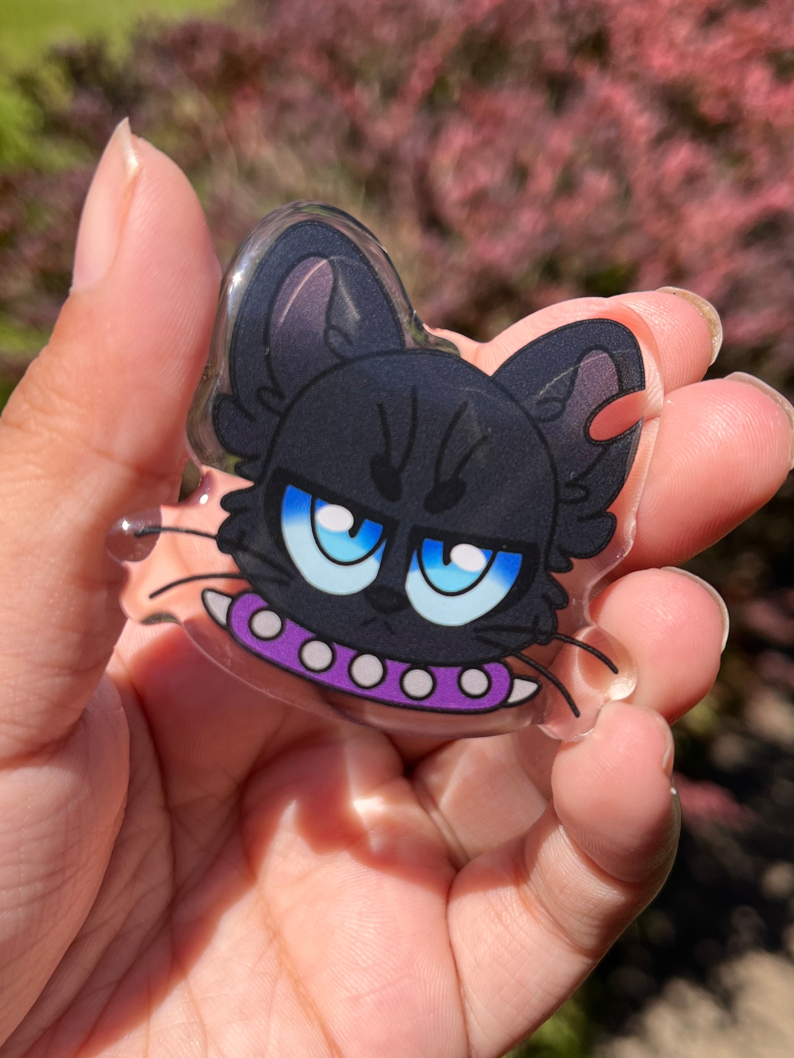 this emo cutie is a thick acrylic pin with a epoxy dome and a black heart clutch