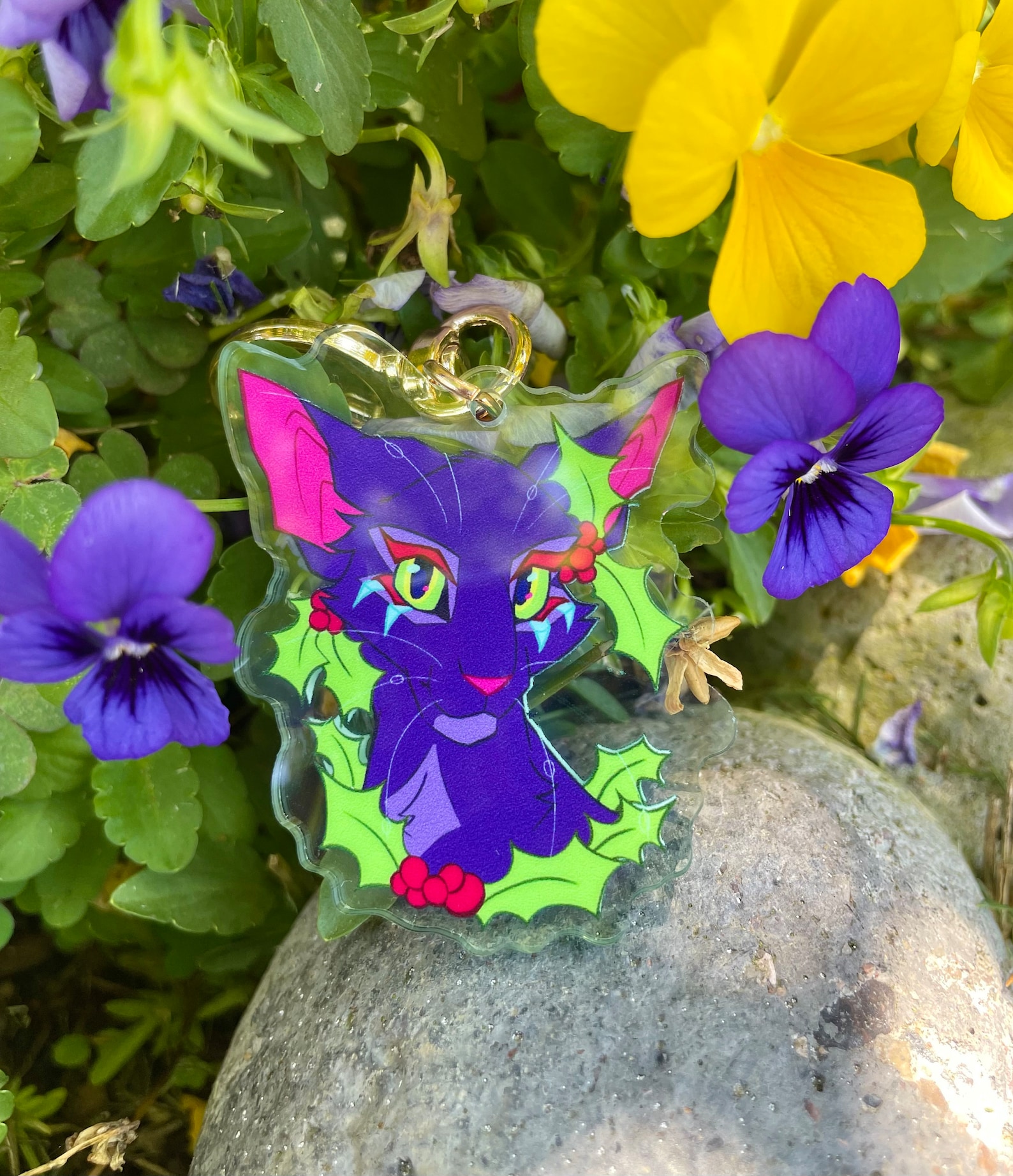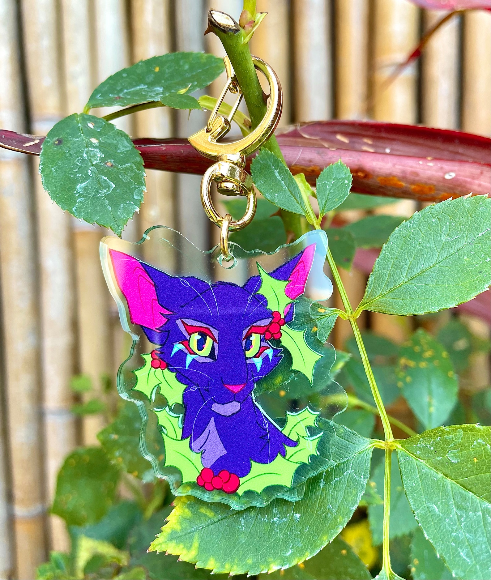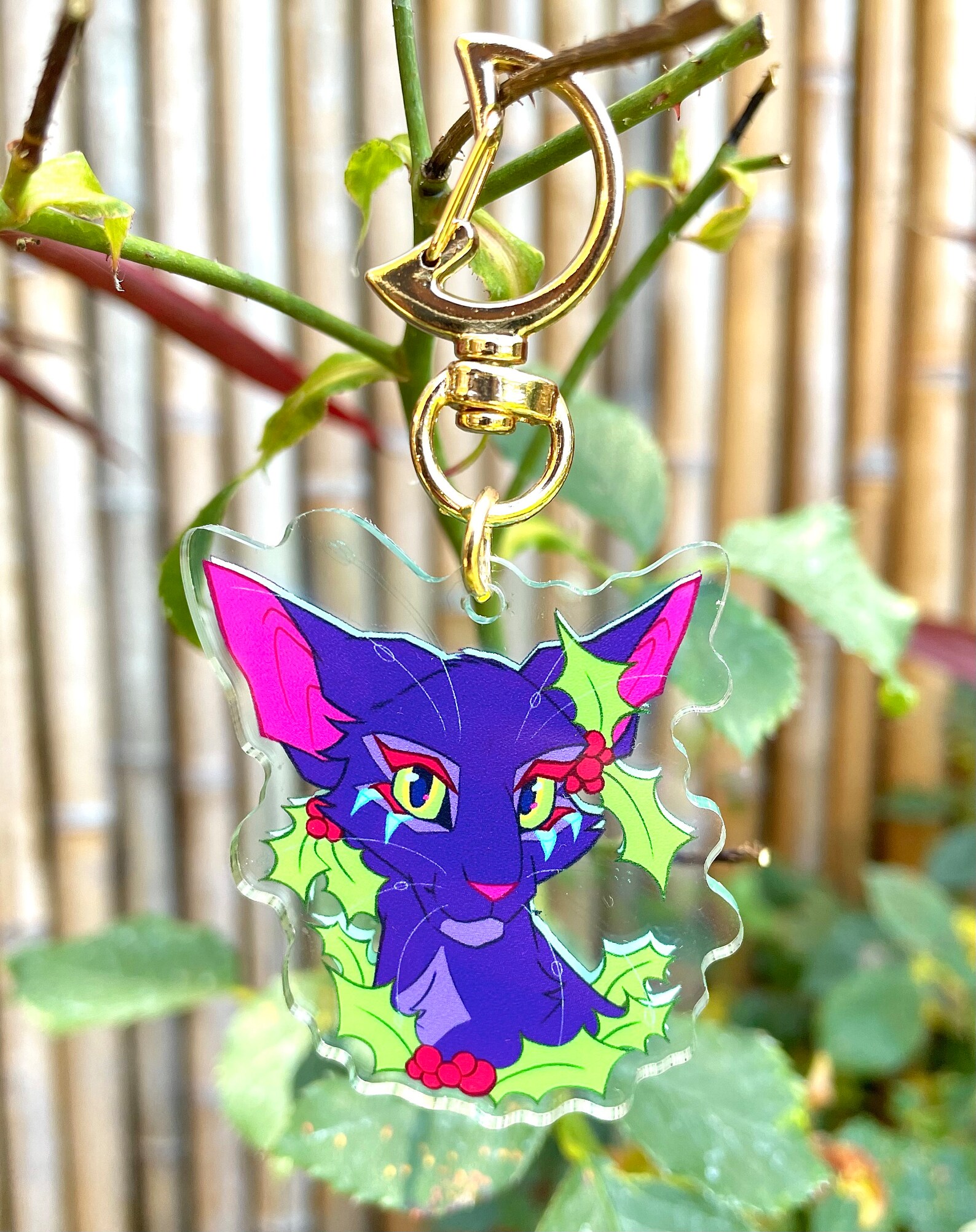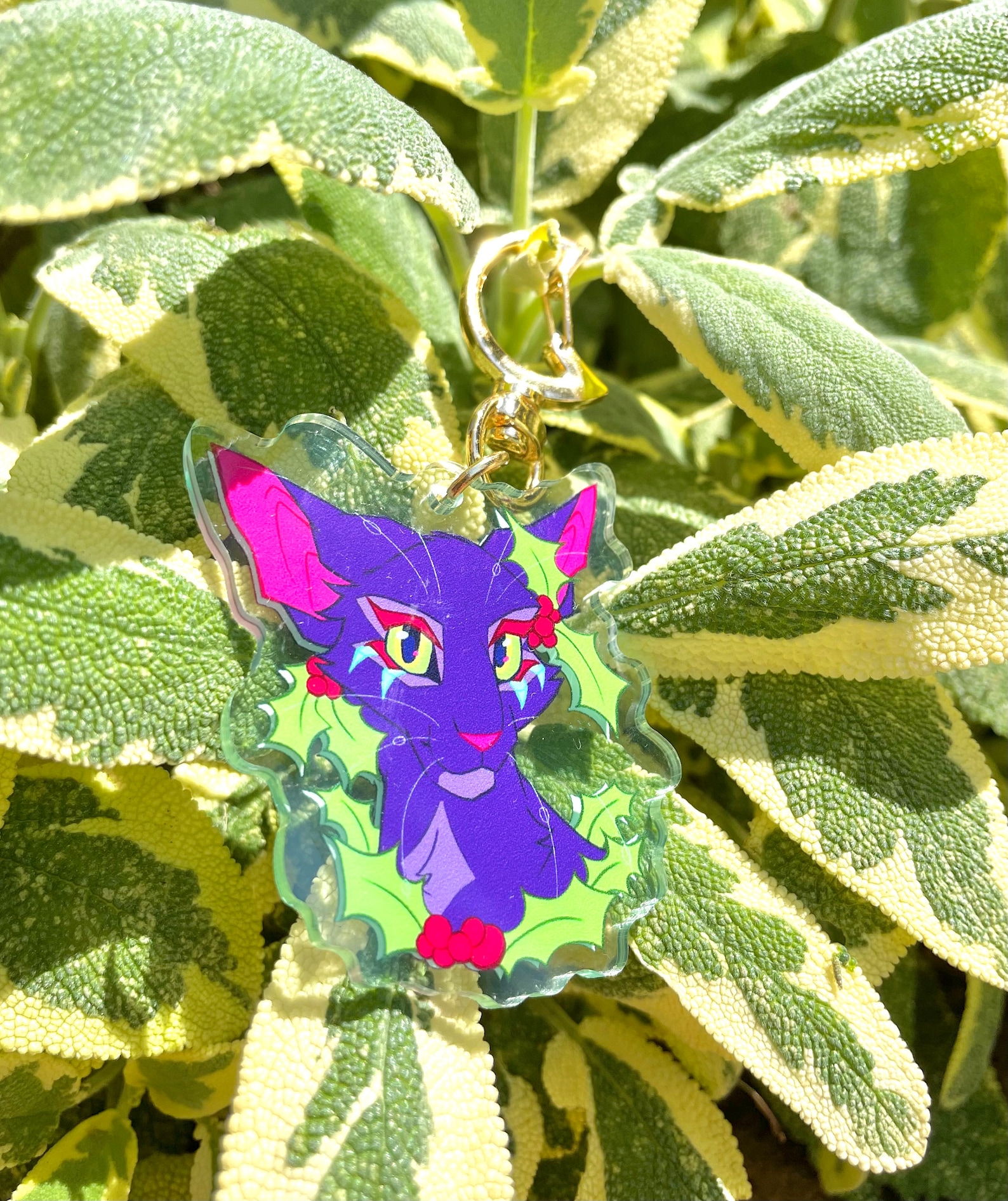 The brightly colored drawing of the keychain was digitally designed and drawn by me! This keychain is of the infamous character Hollyleaf from the Warriors series!