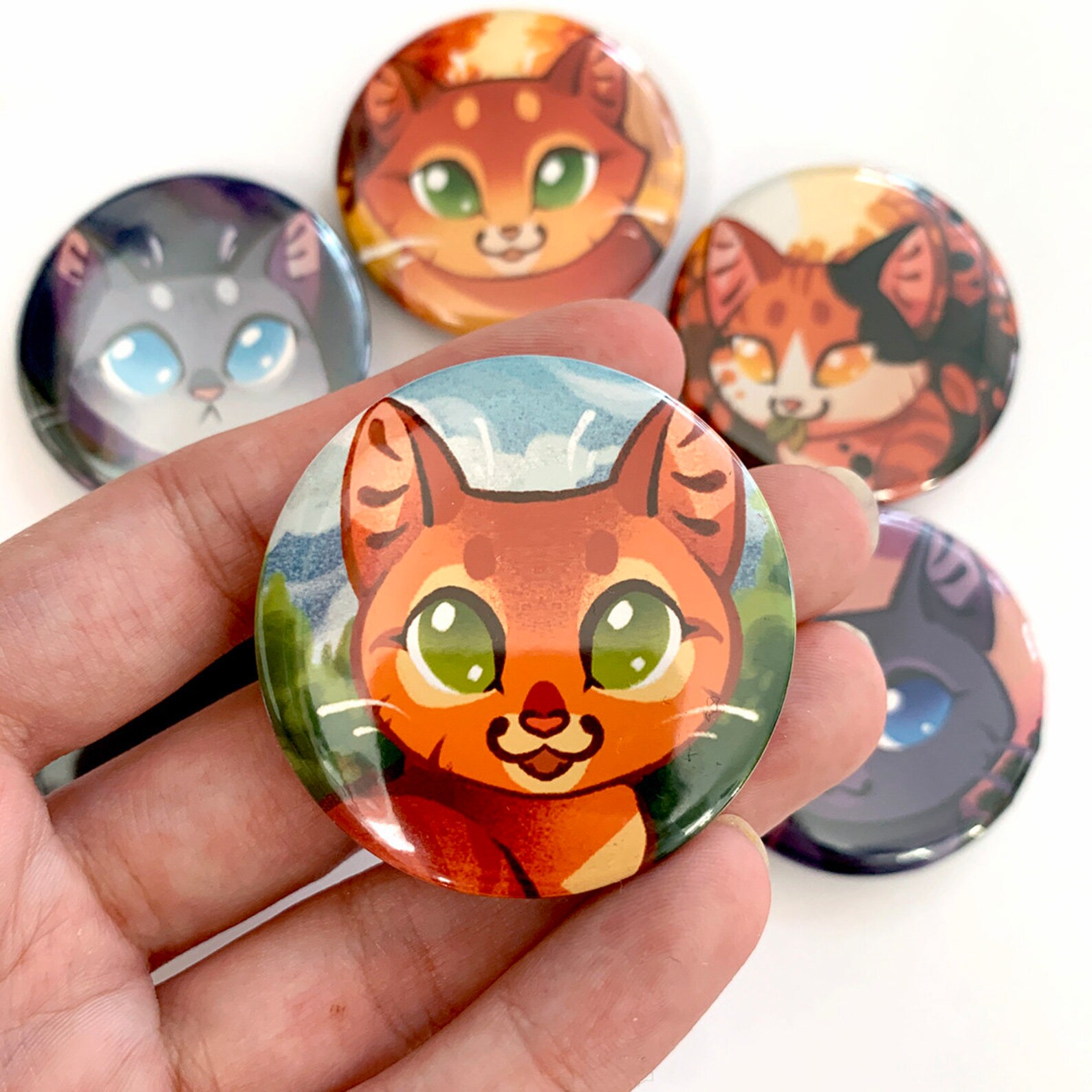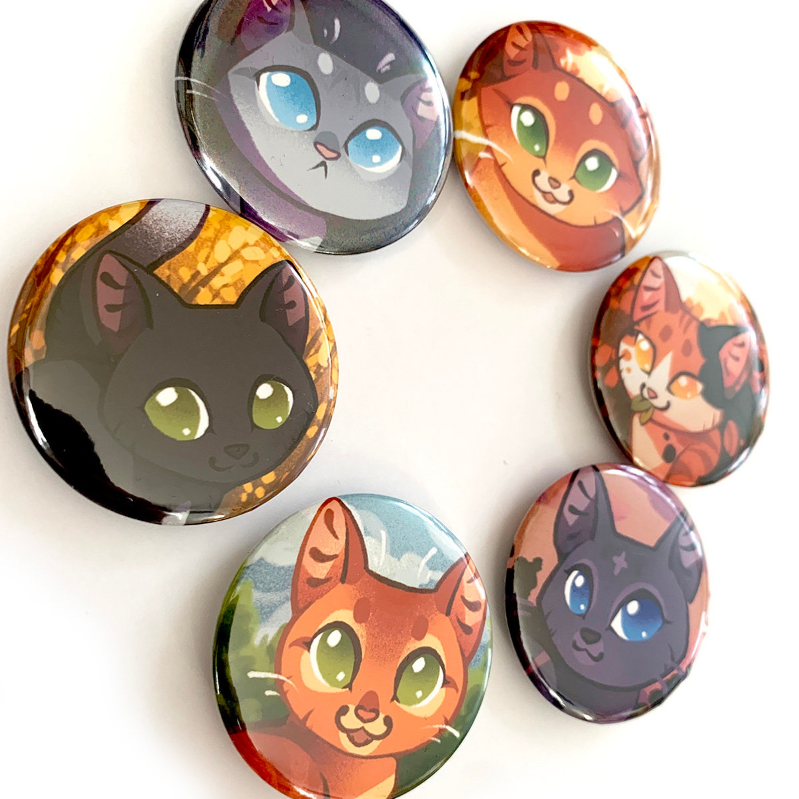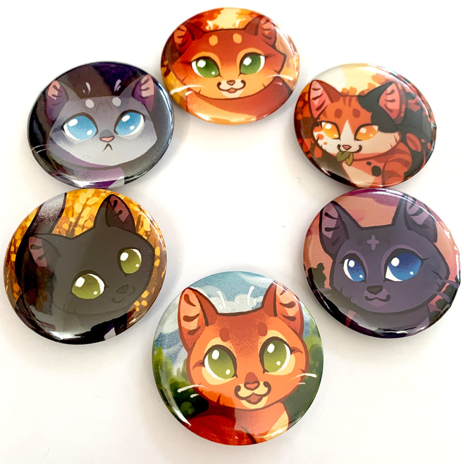 This listing is for a set of 6 warrior cat head pinback button badges.