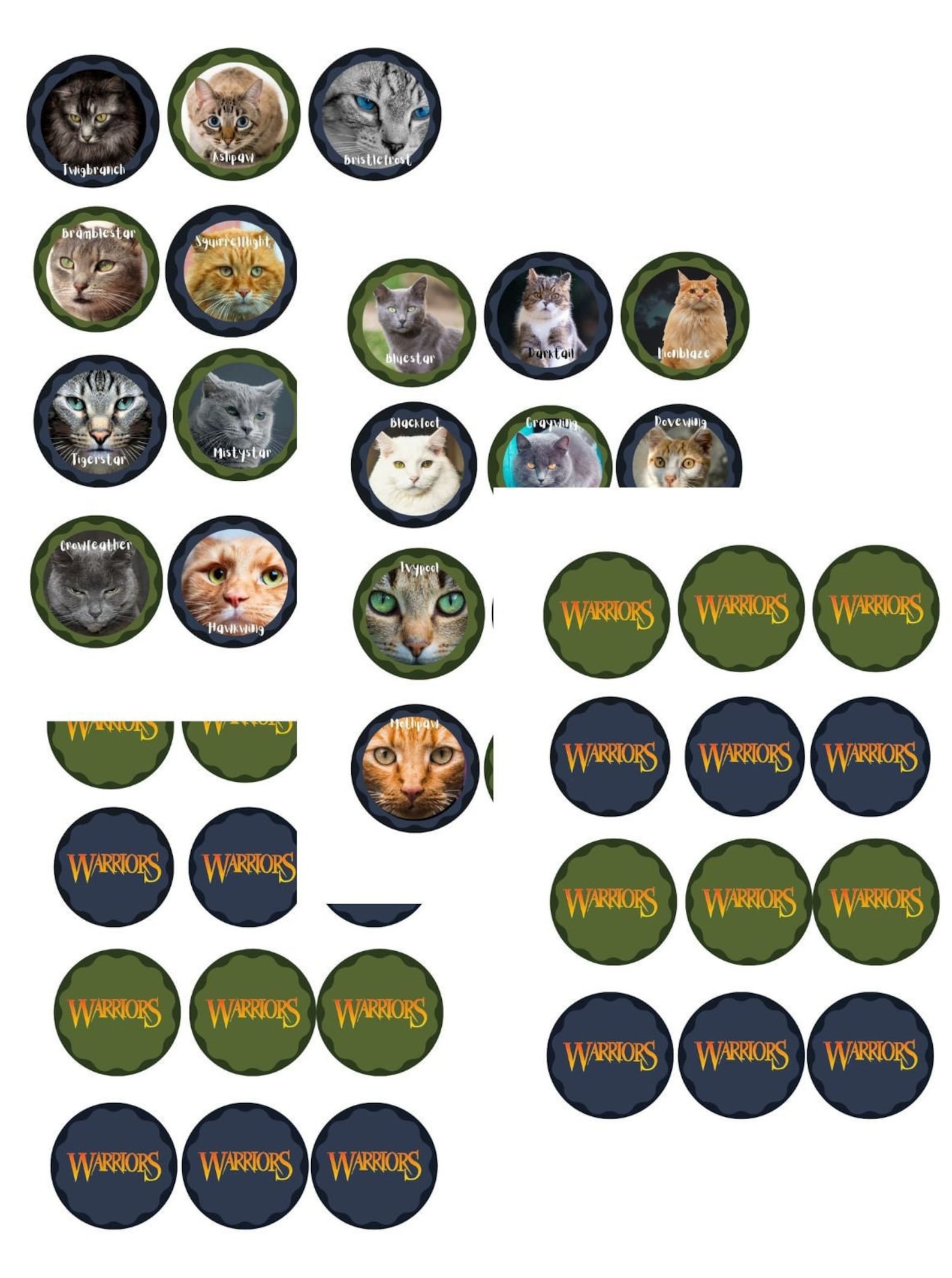 Do you have a kiddo who loves the Warrior Cat book series? Me too! Make their day (or party) with these purple toppers! 24 different cats, with their character names, that your child will love going through and critiquing. You can add a lollipop stick and turn them into a cupcake topper, or tape string or ribbon to the back to make a mini-garland. Please let me know if you have any questions or special requests.