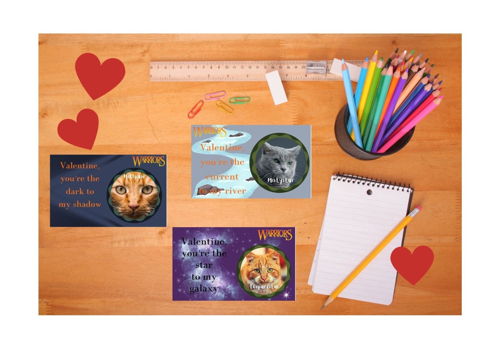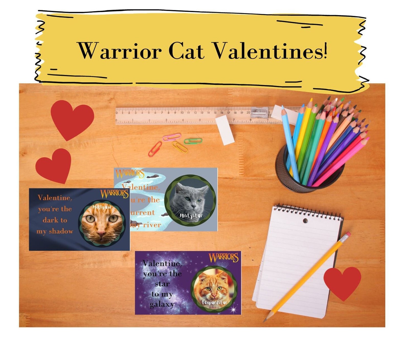 Do you have a kid who loves the Warrior Cat book series? Me too! Here is a set of valentines in pdf format, ready to be downloaded and printed for a last minute save. This file contains 3 sheets of valentines, 8 designs with three different color backgrounds (although you can make as many copies as you want!). This file will be made available for immediate download after purchase. Any questions, please reach out.
