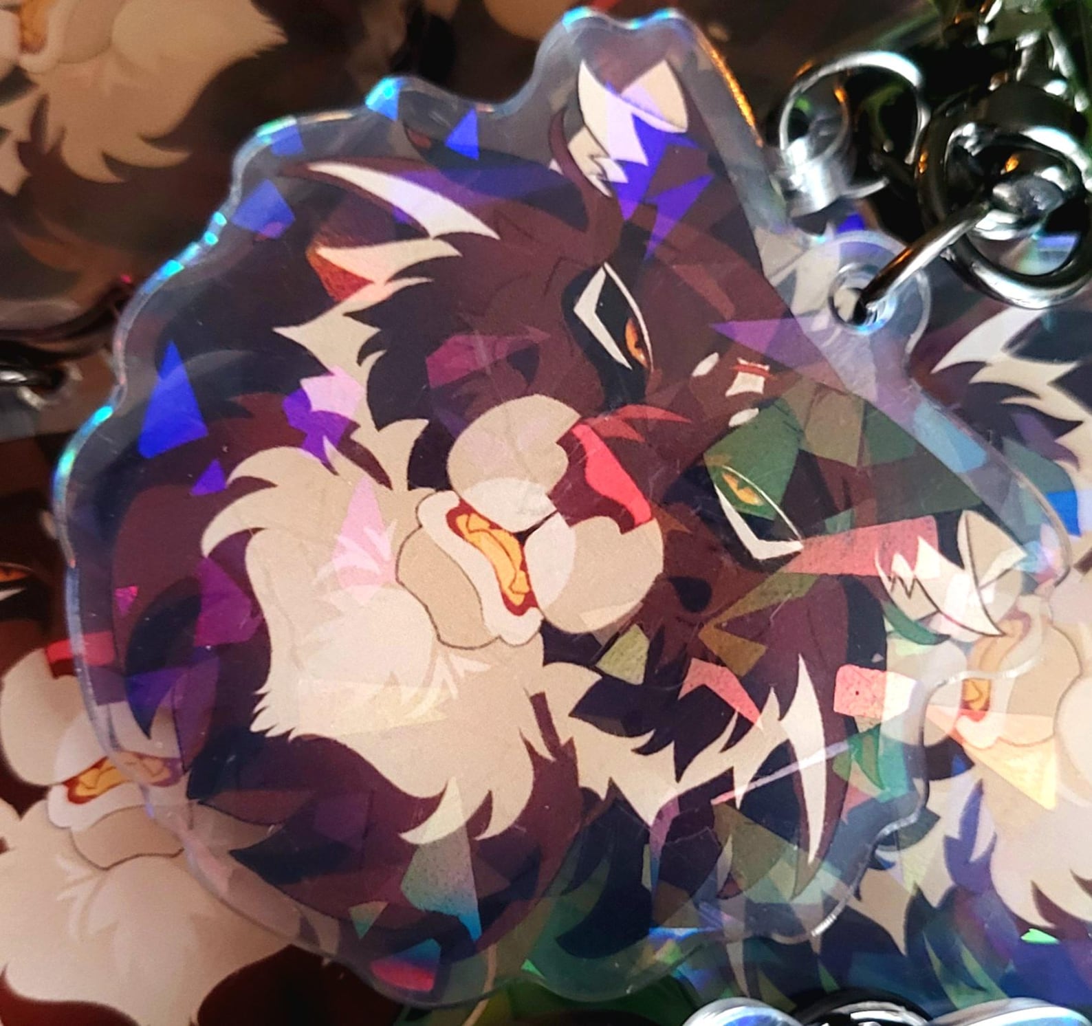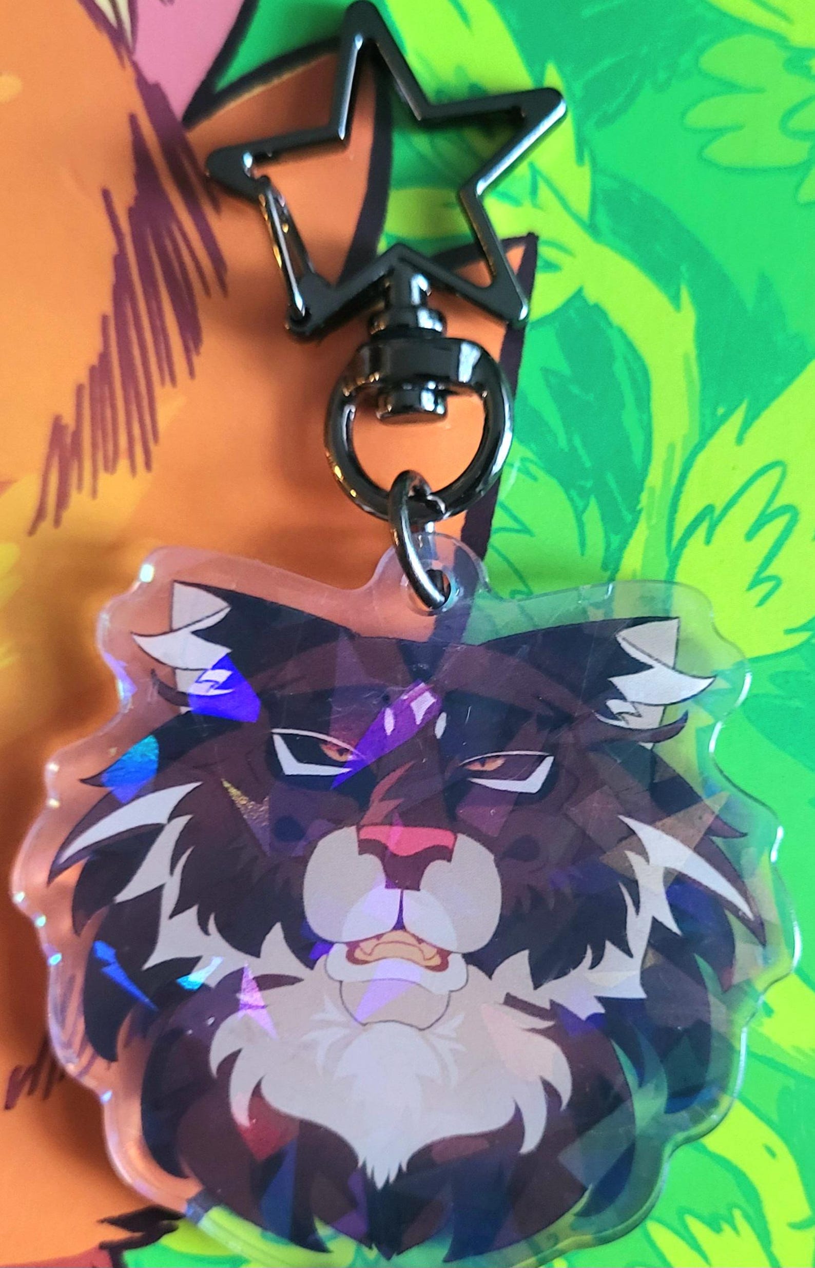 The art is original and made by me! Keychain is one sided holographic with stars that shine under light. The character in the art is Tigerstar, a tyrannical leader and murderous villain.. This would be a great gift for any Warrior Cat fan!