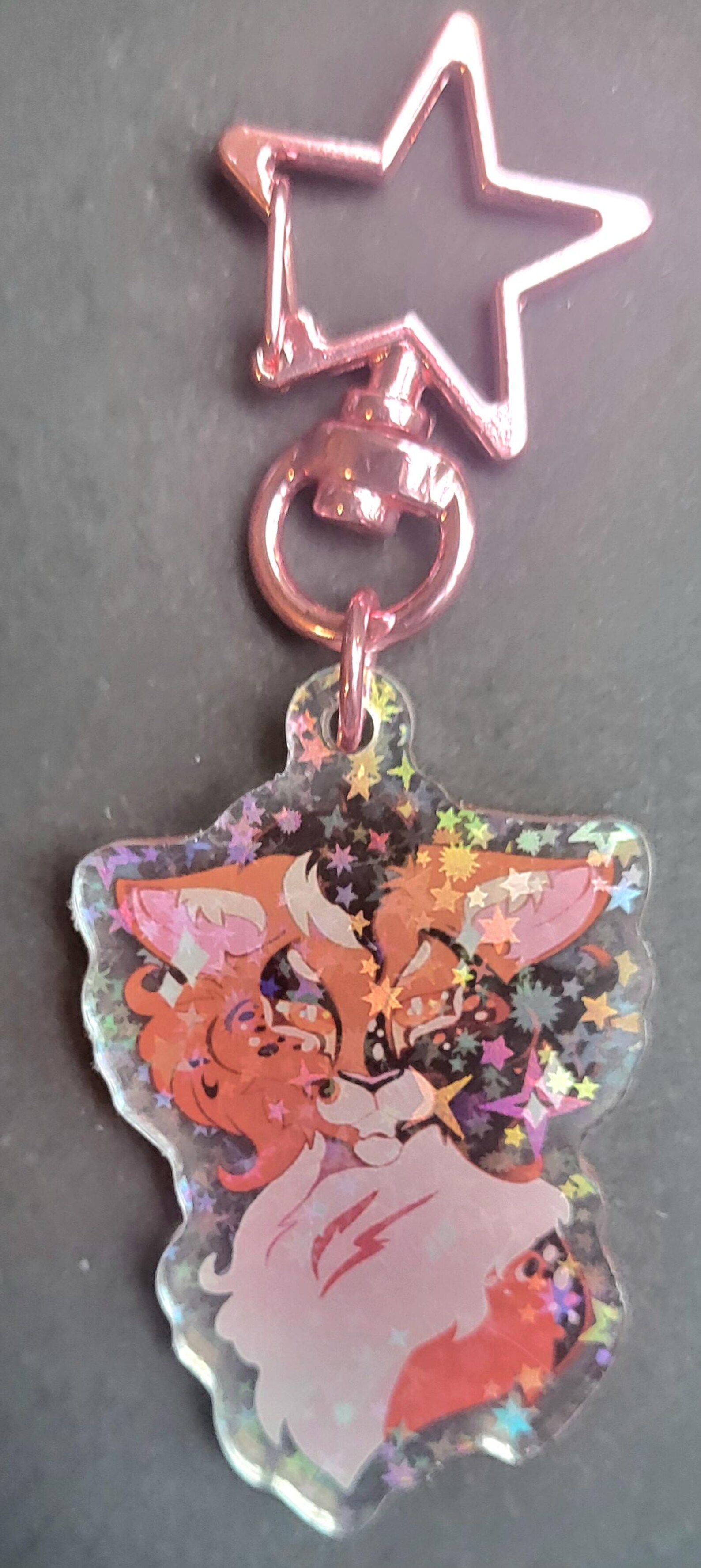 The art is original and made by me! Keychain is double sided holographic with stars that shine under light. The character in the art is Spottedleaf, her clans medicine cat.. This would be a great gift for any Warrior Cat fan!