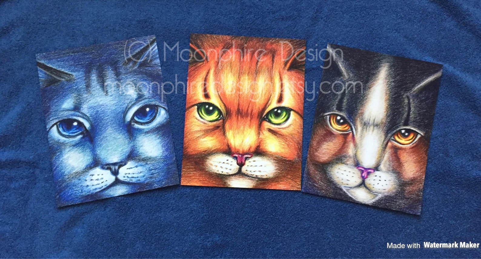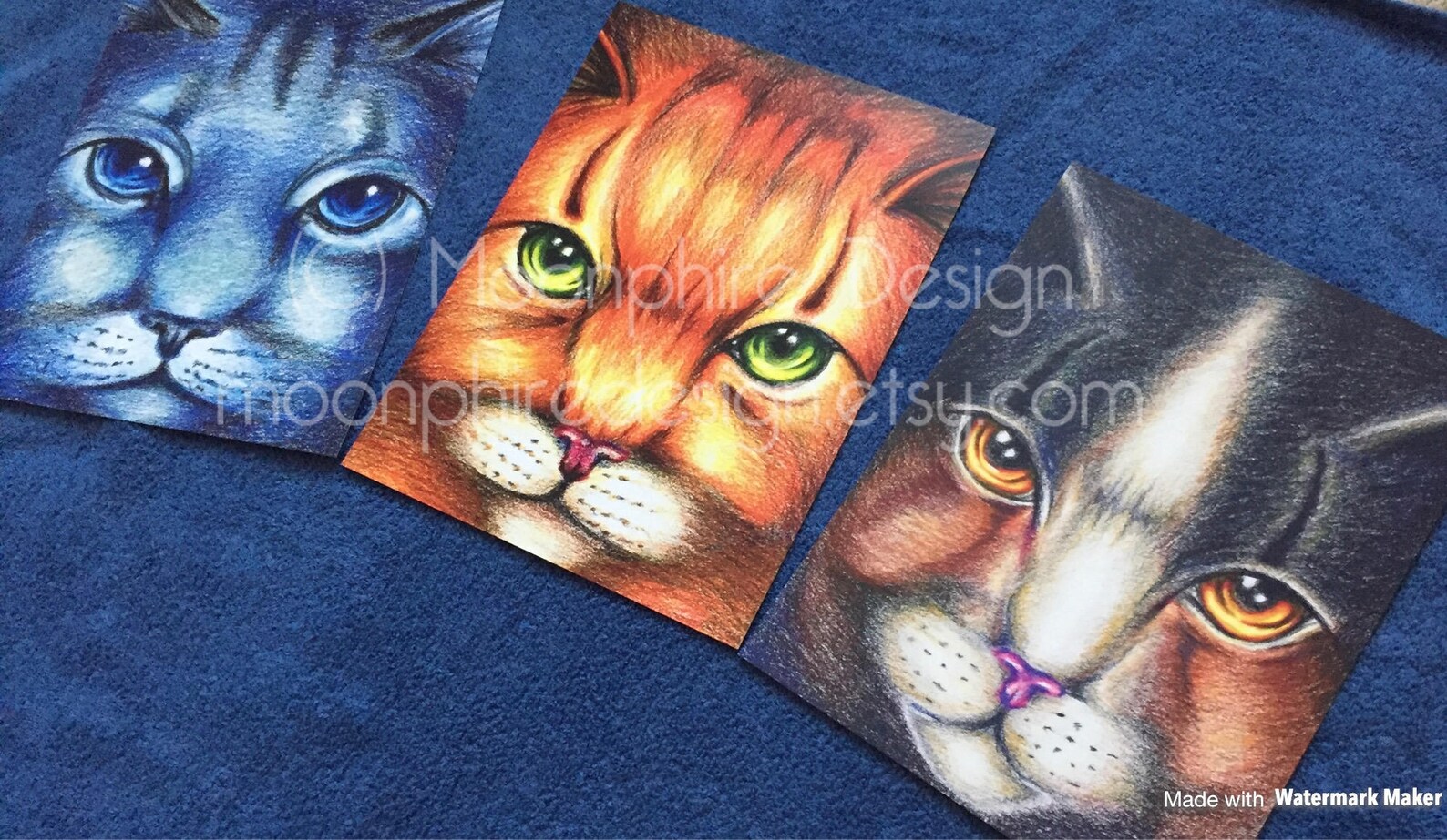Love cats? Then this print set is just the thing! These three cats originally were drawn solely with colored pencils and then transformed into digital prints. All prints are printed full bleed on 80 lbs. glossy laser paper. Each print comes with a plastic covering and is shipped in a sturdy cardboard holder.