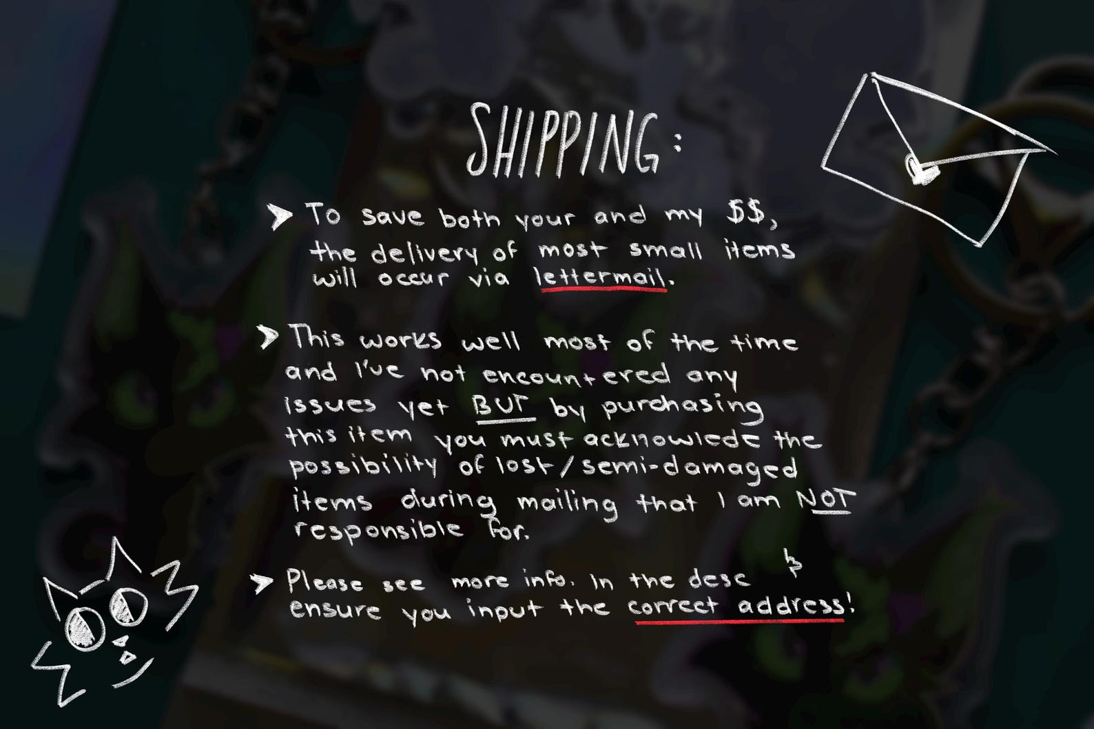 Because the items are small, I prefer to lettermail them. I've never had issues with lettermail in the past, but this mailing type does not offer tracking and to be safe I will send it in a different kind of packaging than the larger, bulkier mailers, so there is the small possibility that damages or losses may happen in the delivery process which I am NOT responsible for. Please note that if you purchase this item, you automatically acknowledge this.