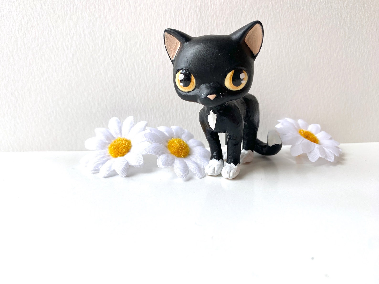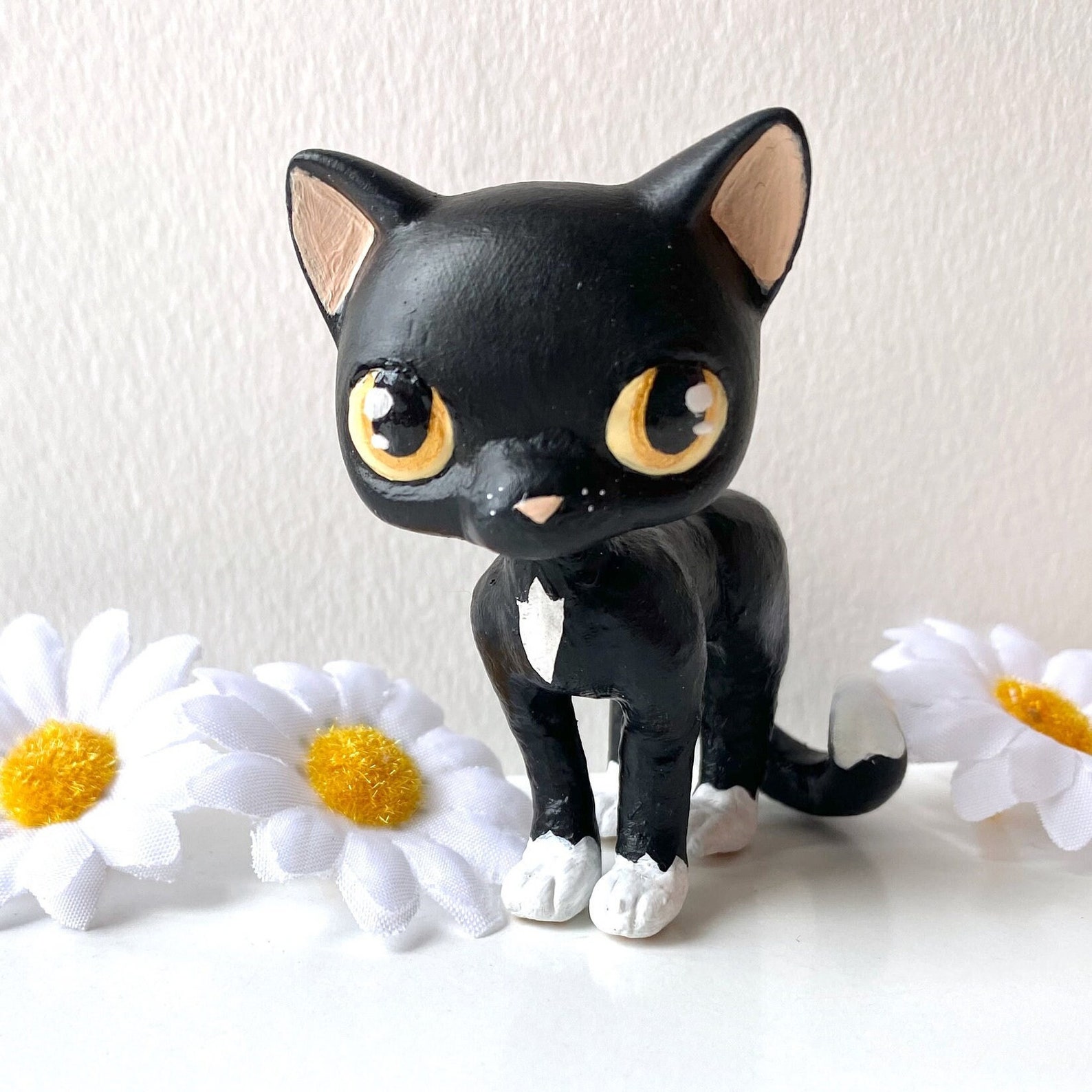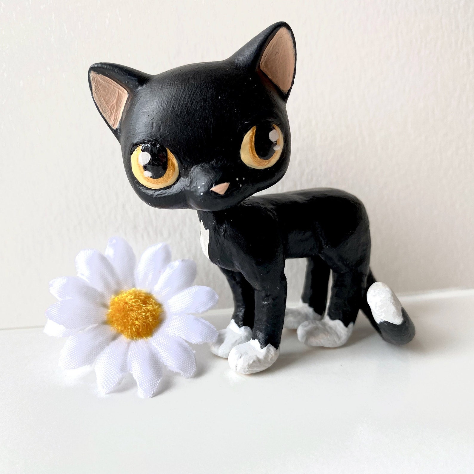 Each Custom takes up to 10 hours to sculpt, sand, paint and seal. He has a black coat with white paws and tail tip, and has been sealed with a matt sealant to ensure his coat stays beautiful. I have even added pink toe beans to his feet! His eyes have been painted with the smallest brush to make sure I could capture the detail of his eyes. His eyes are yellow with a sparkling gold iris. His eyes and nose have been sealed with a high gloss varnish. This figure is delicate so not for rough play.