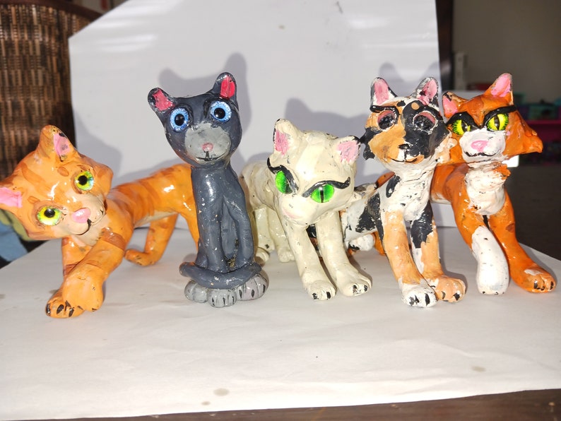 Warrior cats thunderclan figurine set.This set includes:Squirrelflight/Squirrelstar: The current leader and former deputy of thunderclanFirestar: The leader of thunderclan before BramblestarSpottedleaf: Thunderclans medicine cat in Into the wild.Sandstorm: Firestars mate and the mother of squirrelflight and leafpoolbluestar: the leader of thunderclan in the first warriors book Into the wild(All figures are made to order so they're may be some differences from the photos)
