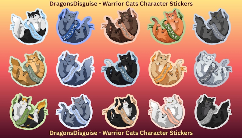 2.25 X 2.5-inch stickers of various Warrior Cats Characters designed by me! 15 characters are currently available!