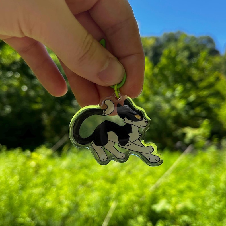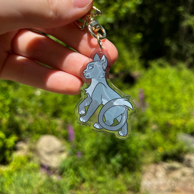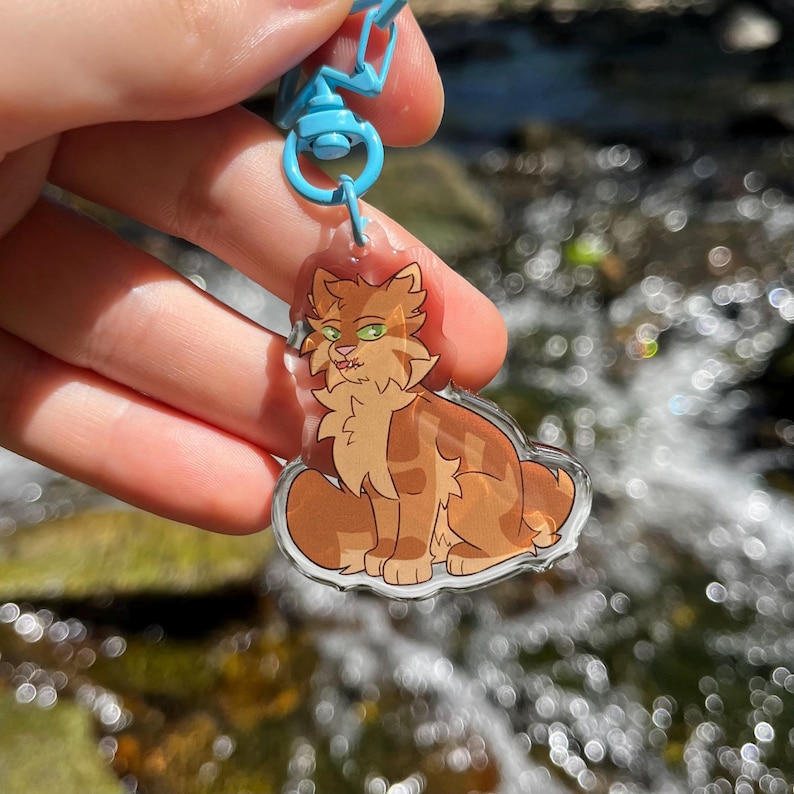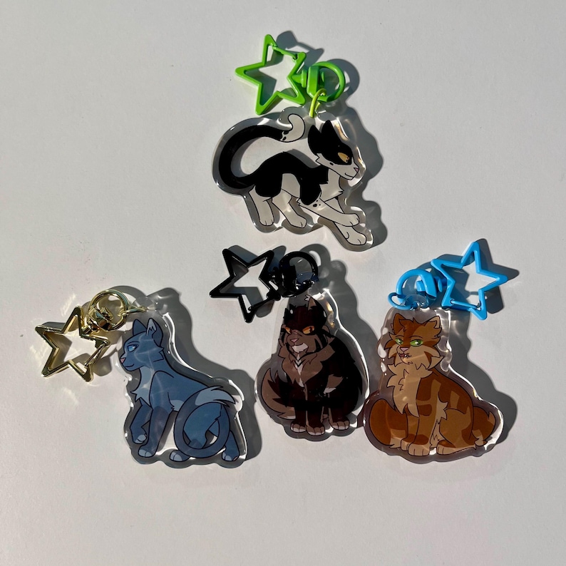 Double sided 2 in. The Prophecies Begin Leaders Bluestar, Crookedstar, Tallstar, Tigerstar warrior kitties (front side epoxy) keychain charms for backpacks, purses, display, etc.