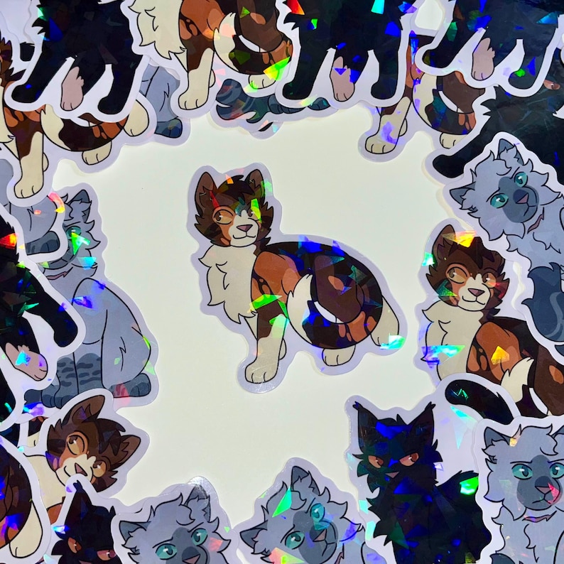 Warrior kitties A Starless Clan stickers for decorating water bottles, journals, etc. Characters Sunbeam, Nightheart, and Frostpaw. 2.5 inches, holographic broken glass effect.