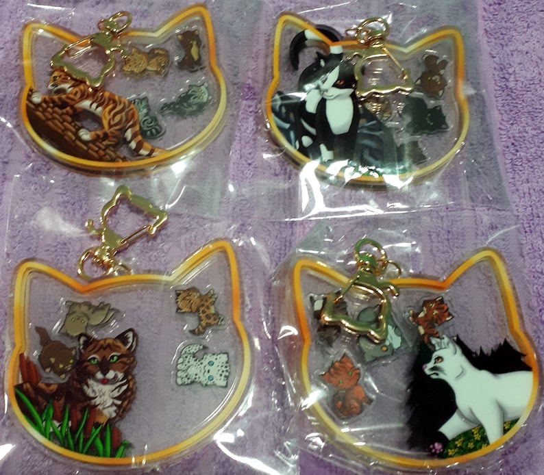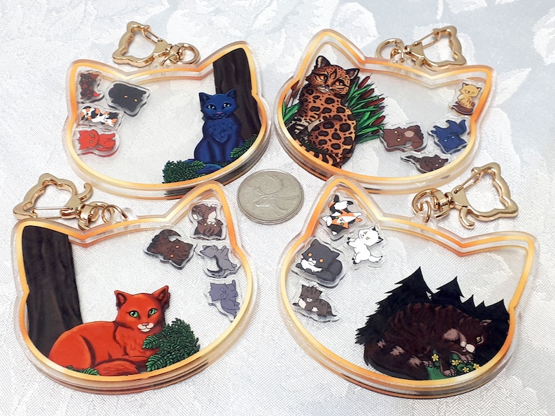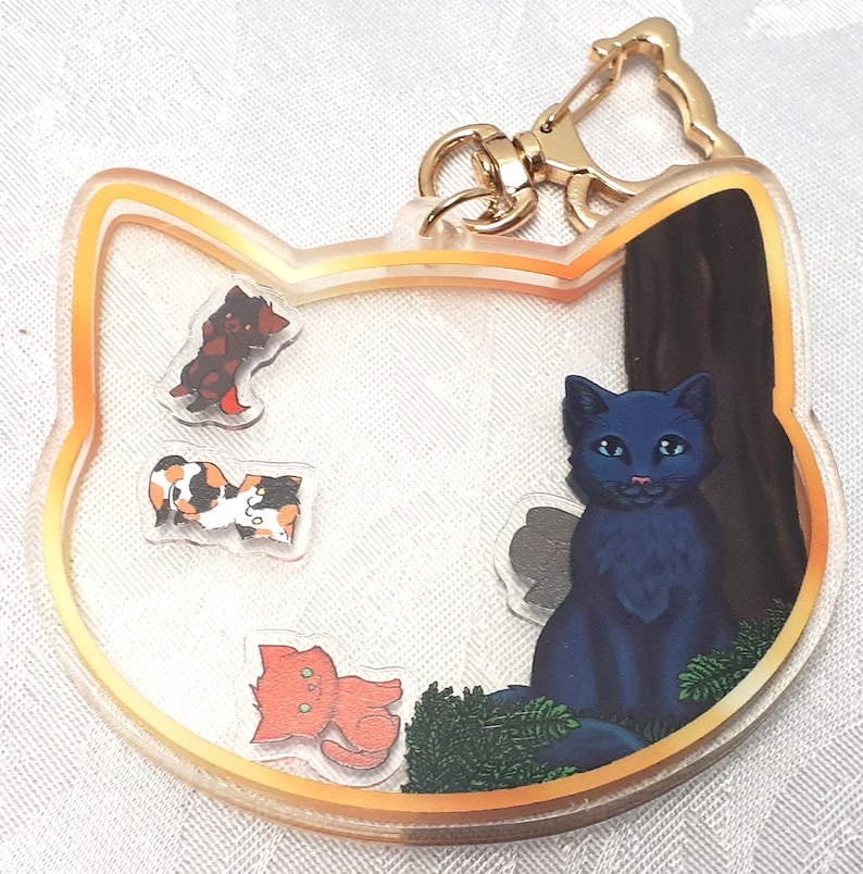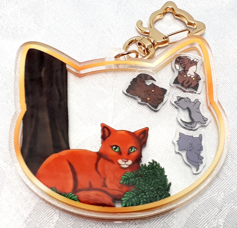 These are Warriors Shaker Charms! A shaker charm is a charm that features an outside graphic, and then there are small pieces inside that move, thus the name! It features each of the leaders on the outside, with an environment that fits with their territory, with four of either their medicine cat or their deputies. If there was more than four, then in the case only the most significant were chosen (or at least, in my opinion) or they are featured in another leaders charm. Also they all feature a cute cat shaped keychain clasp!