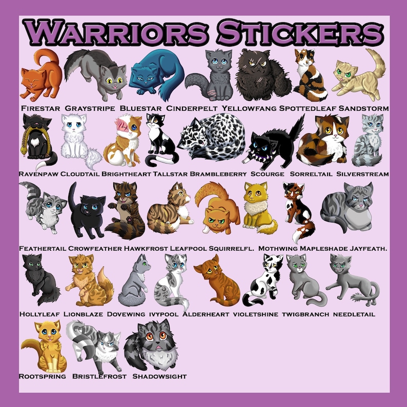 Need some cute cats to spice up your life? Here is some chibi stickers based off of Warrior Cats! All drawn with unique poses. These are reasonably waterproof, and they have a matte finish that looks and feels really nice! They are 3 inches large, and are perfect for water bottles, laptops and more!