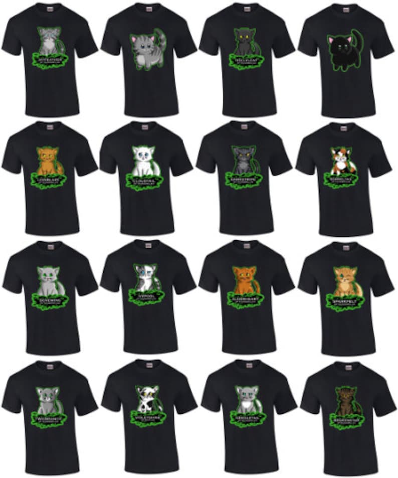What better way to show off your love for a certain Warriors character than with a shirt? This listing has a selection of a wide variety of characters from the Warriors, and features characters from most of the books, many of them having several options to choose from!