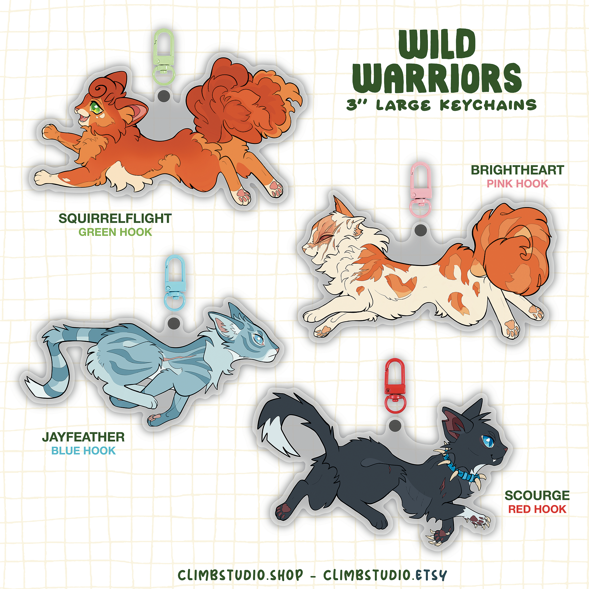 *THIS ITEM IS FOR PRE-ORDER & IS EXPECTED TO SHIP LATE OCTOBER. ALL PRE-ORDERS COME WITH FREEBIES * Wild Warriors - Squirrelflight, Brightheart, Jayfeather, Scourge Available as single keychains or as a set Keychains are large 3" double-sided, clear acrylic and come with colored hooks.