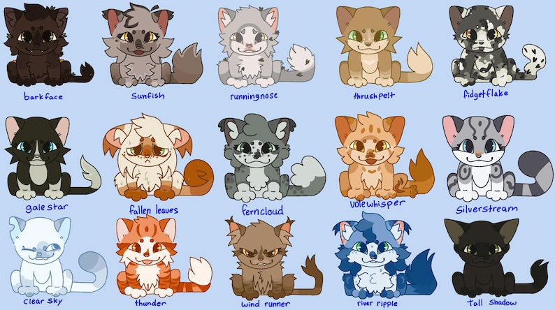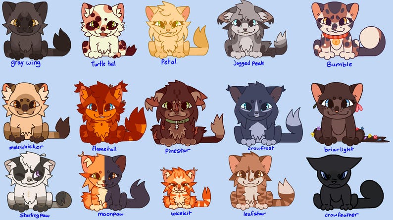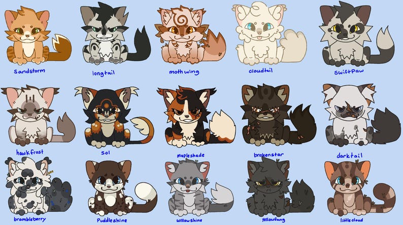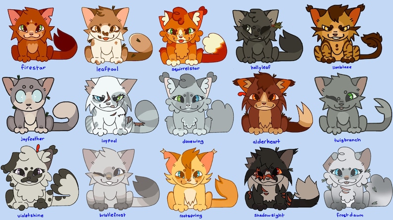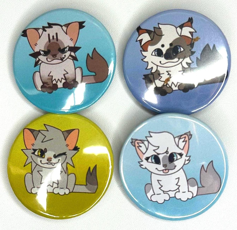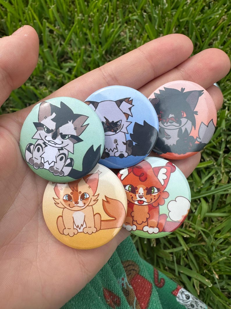 A smaller, and more chubby version of your favorite Warrior cat characters turned into Buttons! Each button is printed and pressed by me, Most are made to order so will never run out of stock! Colors may look a bit different from image when printed and button backing may be a bit crooked. almost weekly characer updates! (this also goes for my stickers too!)