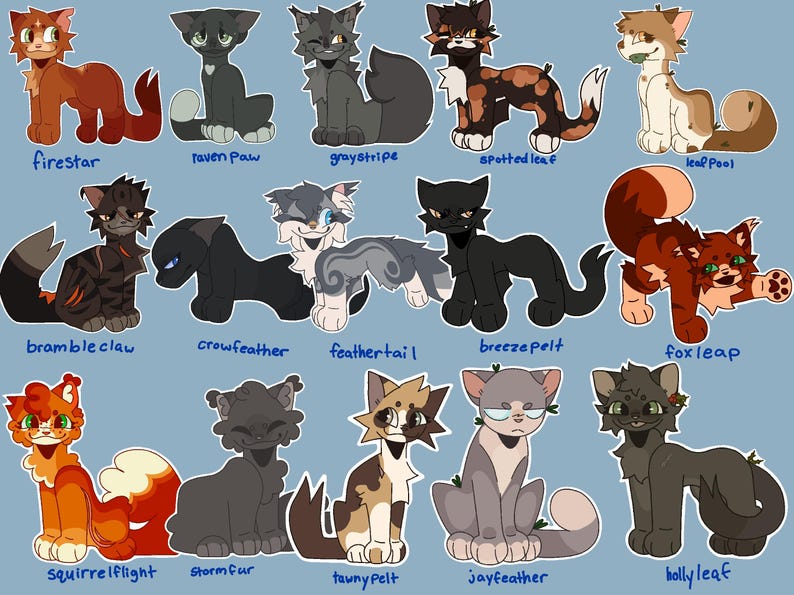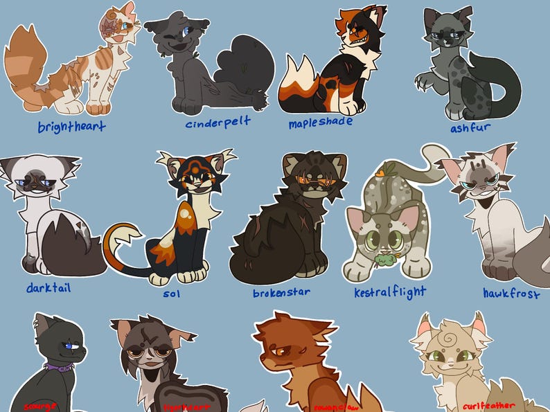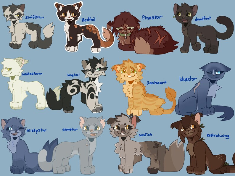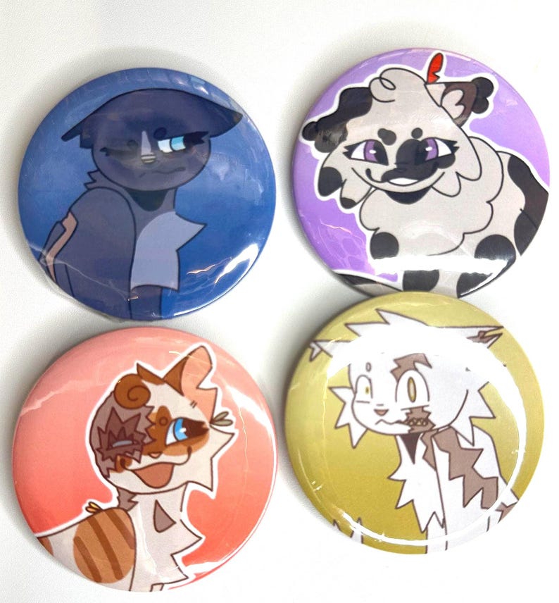 Warrior cat button pins based off the characters you love in Warrior cats! featuring 43 different designs, and more designs will be added, make sure to look at the photos for your favorite cat! (i also take request!) These jumbo pins are 58mm and will look nicely on a bag, hat, backpack, ect, you name it! Colors may look a bit different from image when printed and button backing may be a bit crooked. almost weekly characer updates! (this also goes for my stickers too!)