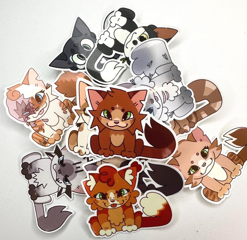 80 designs! 1.6 inch glossy stickers of most of your favorite cats in the clans! These will be sent with a regular envelope without tracking