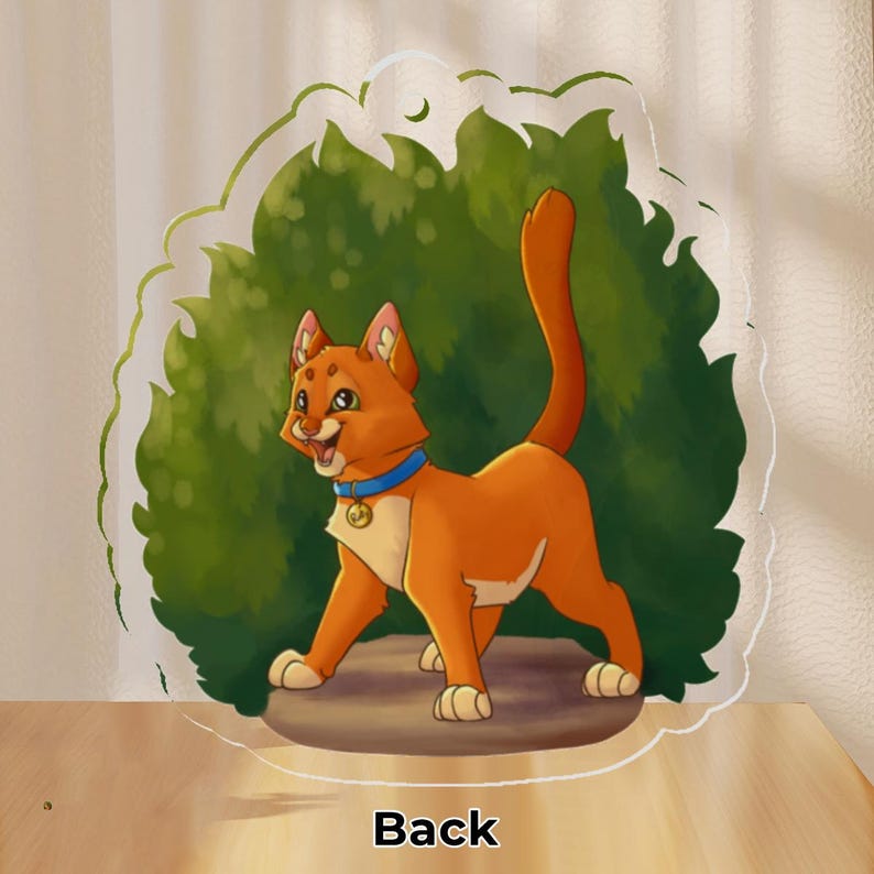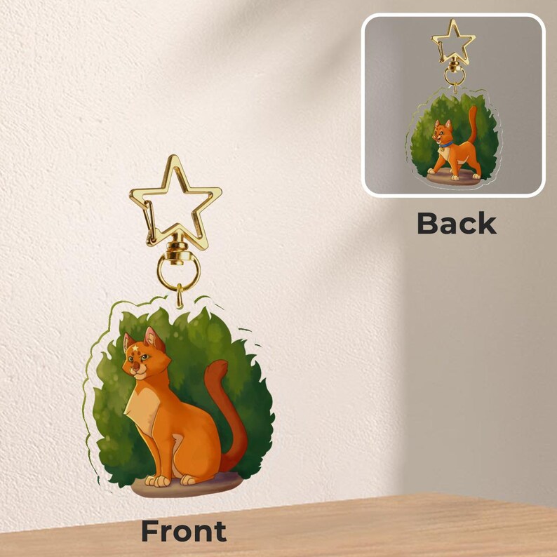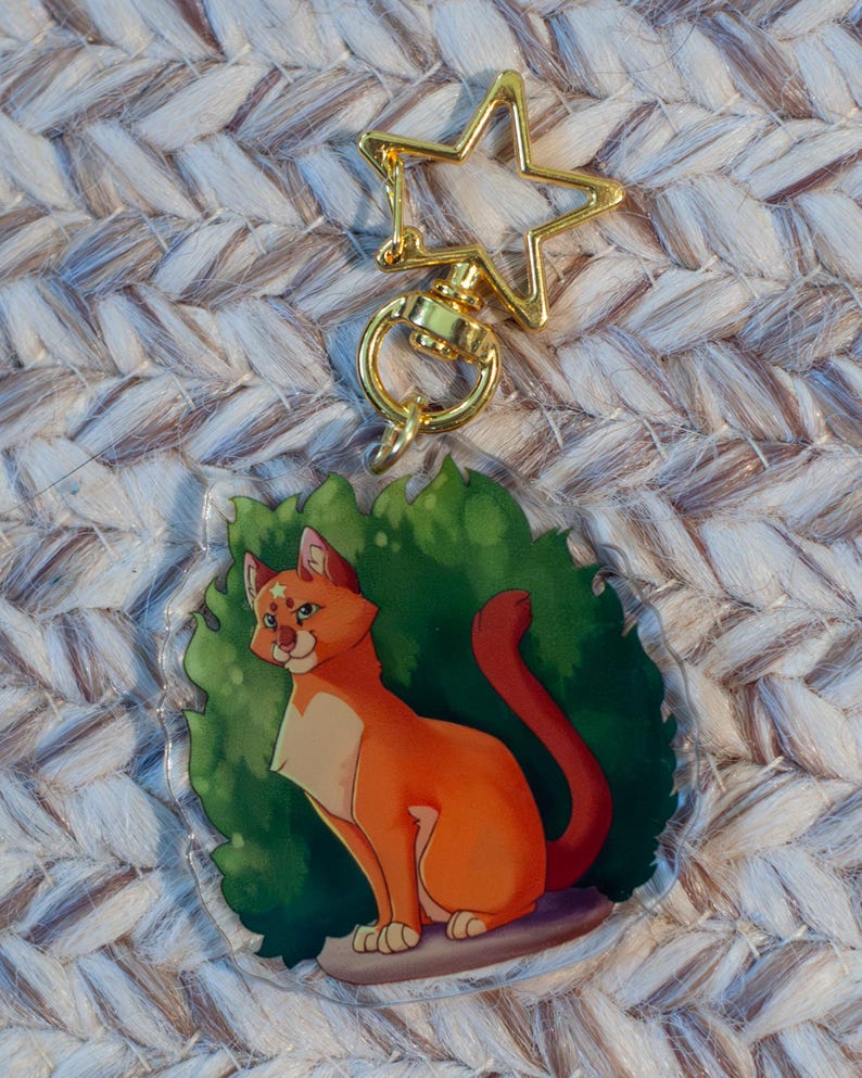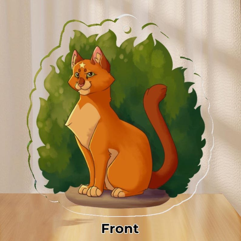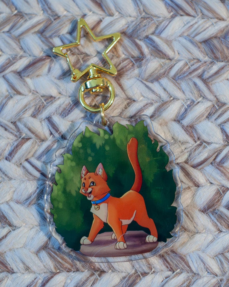 Acrylic keychain of Firestar and Rusty from Warriors: The Prophecies Begin! One side of the keychain features Rusty just as he begins his journey into the forest territories, and the other side features Firestar, now the proud leader of ThunderClan.