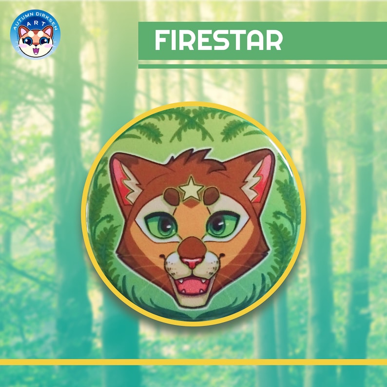 Handmade buttons of the Warrior Cats Series 1 protagonists; Fireheart, Greystripe, Sandstorm, and Ravenpaw, measuring at 1.75 inches (44 mm).