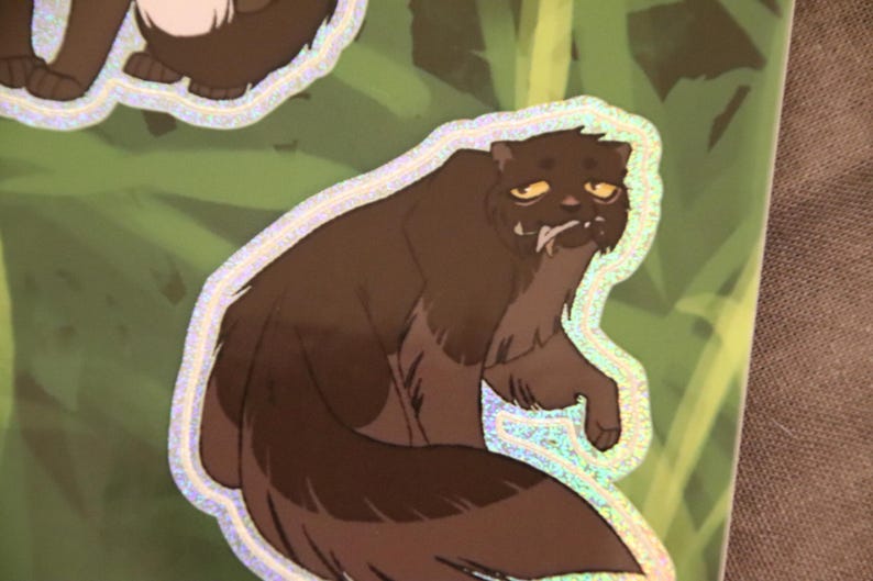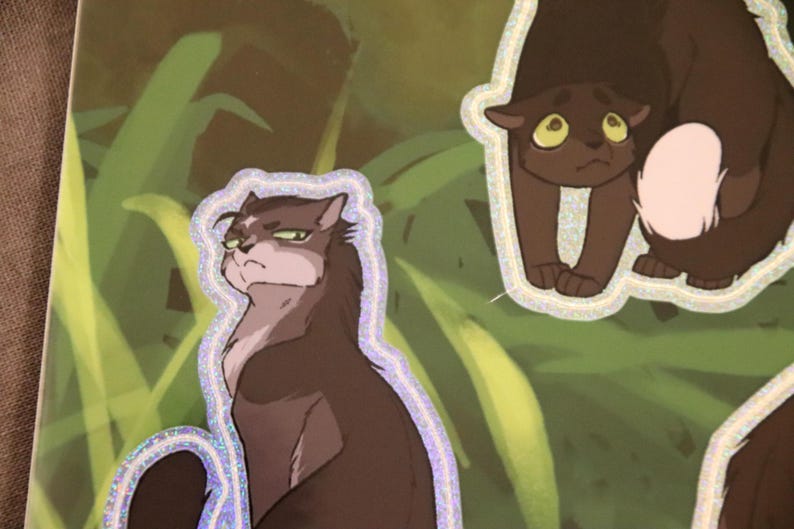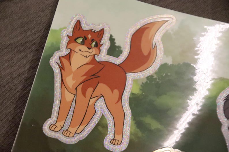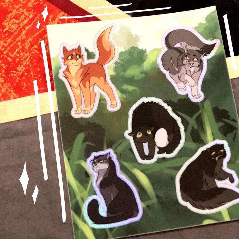A sticker sheet featuring various cats from the first series of Warrior Cats! Each kitty has a sparkly pixie dust border in a complimentary color to help them pop wherever they are!