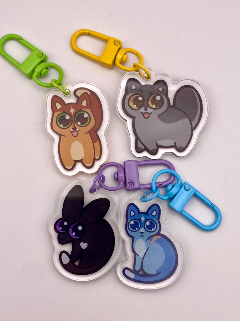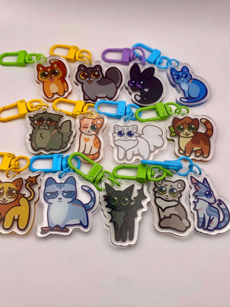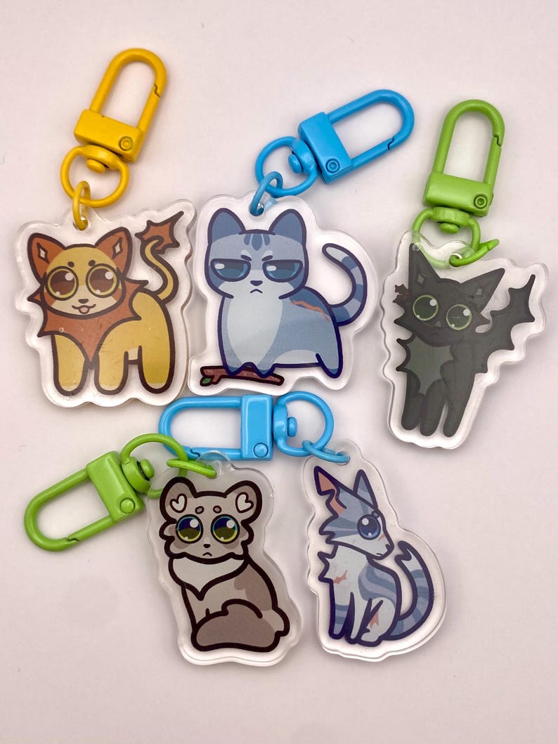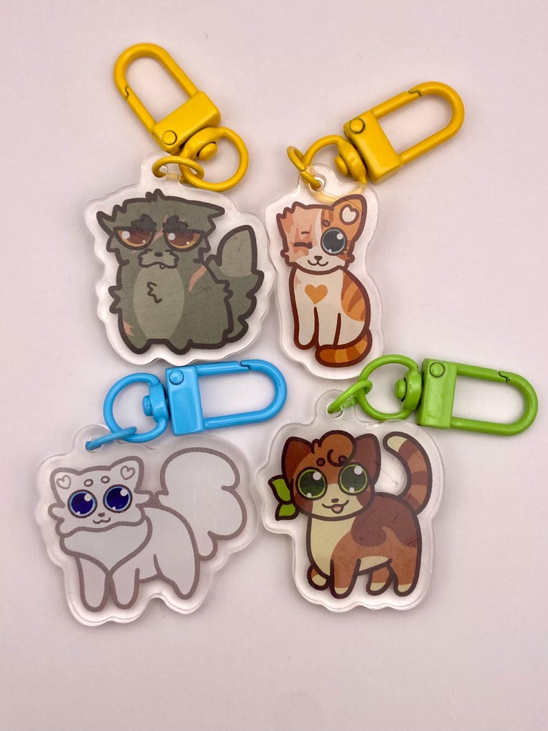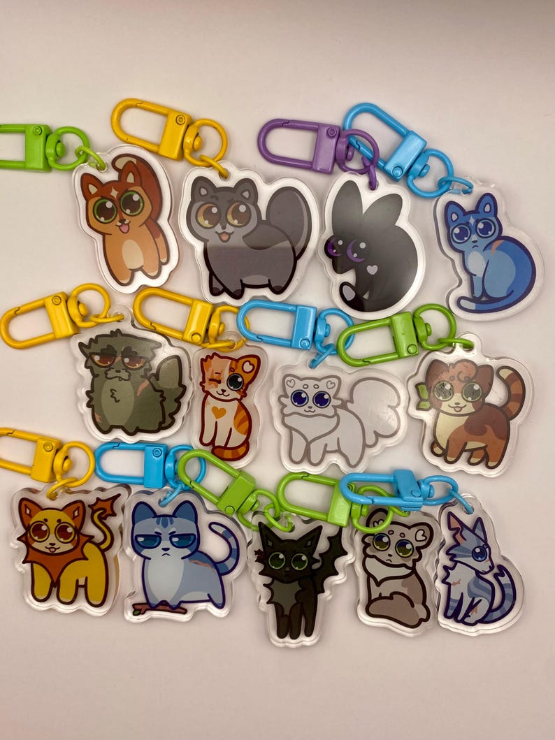 These 1.5-inch acrylic charms feature fan-favorite characters from Warrior Cats, including Firestar, Greystripe, Ravenpaw, Bluestar, Yellowfang, Jayfeather, Brightheart, Cloudtail, Dovewing, Ivypool, Lionblaze, Hollyleaf, and Leafpool.