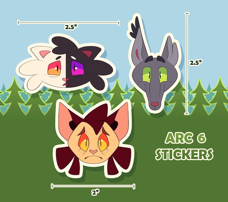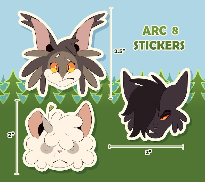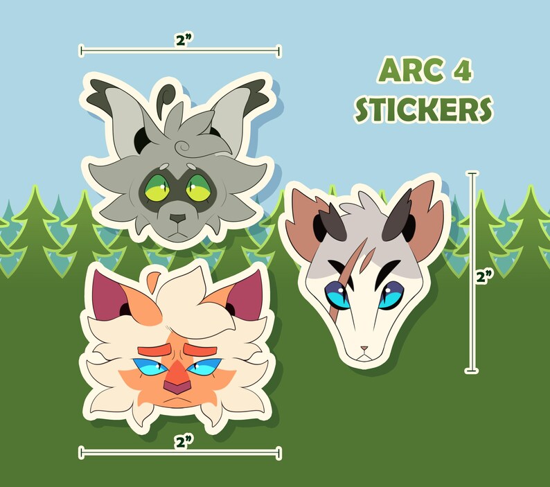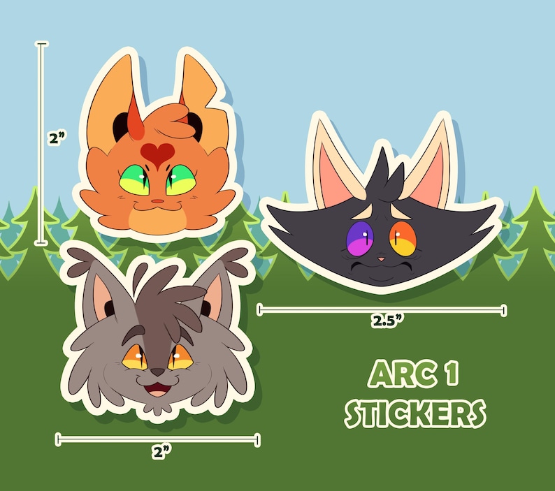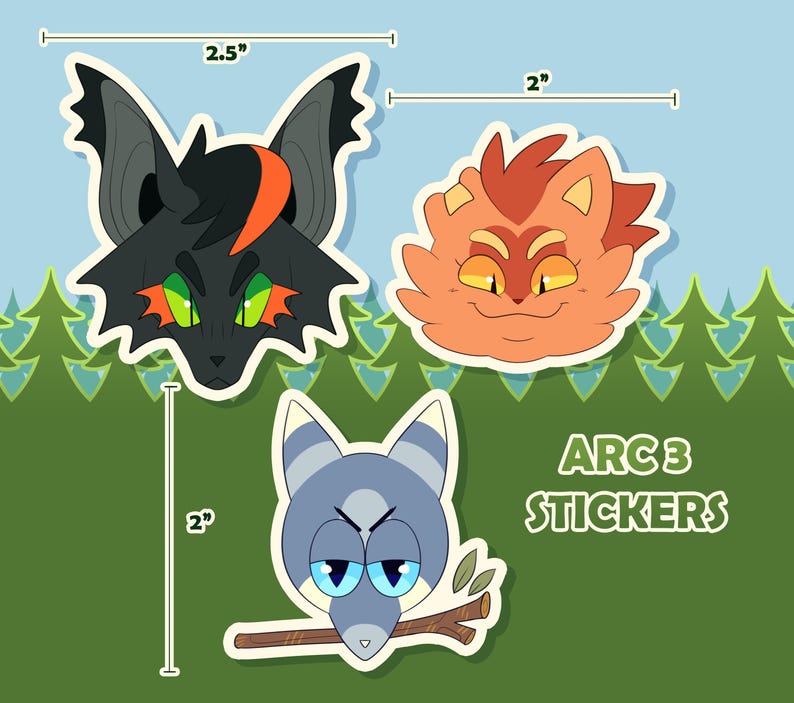 Glossy vinyl stickers featuring the beloved protagonists of Forest Felines! They come in sets of three, one set for each arc! These stickers are durable and suitable for use on notebooks, water bottles, laptops, and other surfaces! They are between 2 and 2.5 inches, depending on character (see images).