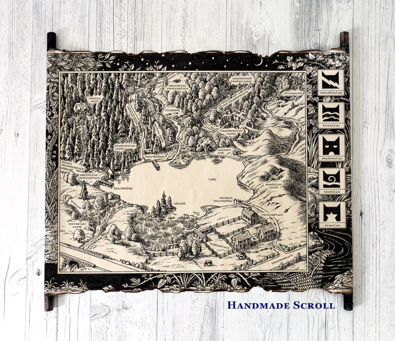 The Warrior Cats Series Map of the Lake Territories, New Territories Map, The New Prophecy Map, Sanctuary Lake, Warrior Cats Book Map, Fantasy Map, Bookish Gifts, Book Lover Gifts, Bookshelf Decor, Free Shipping, Personalized Gifts, Custom Book Maps, Fantasy Art