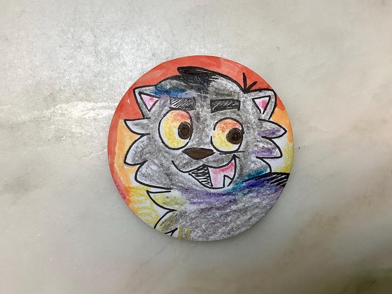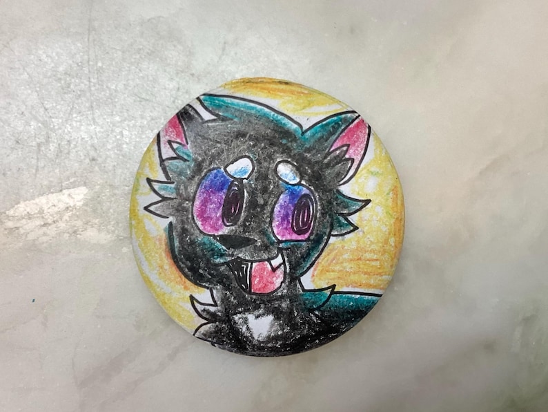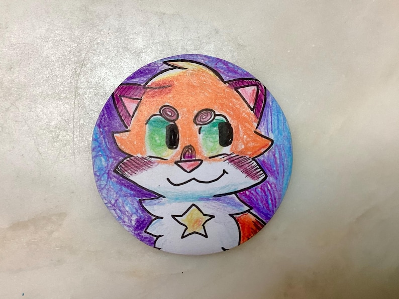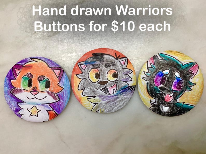Behold, Warrior Cats 2.5" buttons of Firestar, Graystripe, and Ravenpaw in that order. These buttons are handmade and one of a kind. I used colored pencils, crayons, markers, and a button maker to create these.