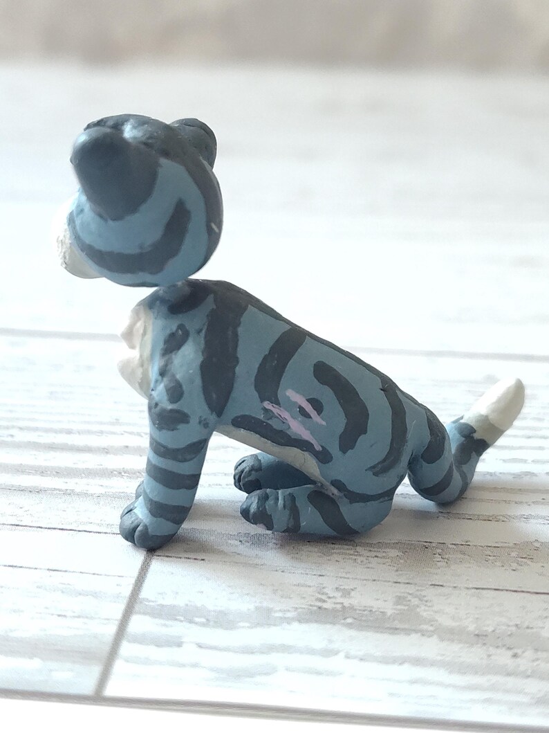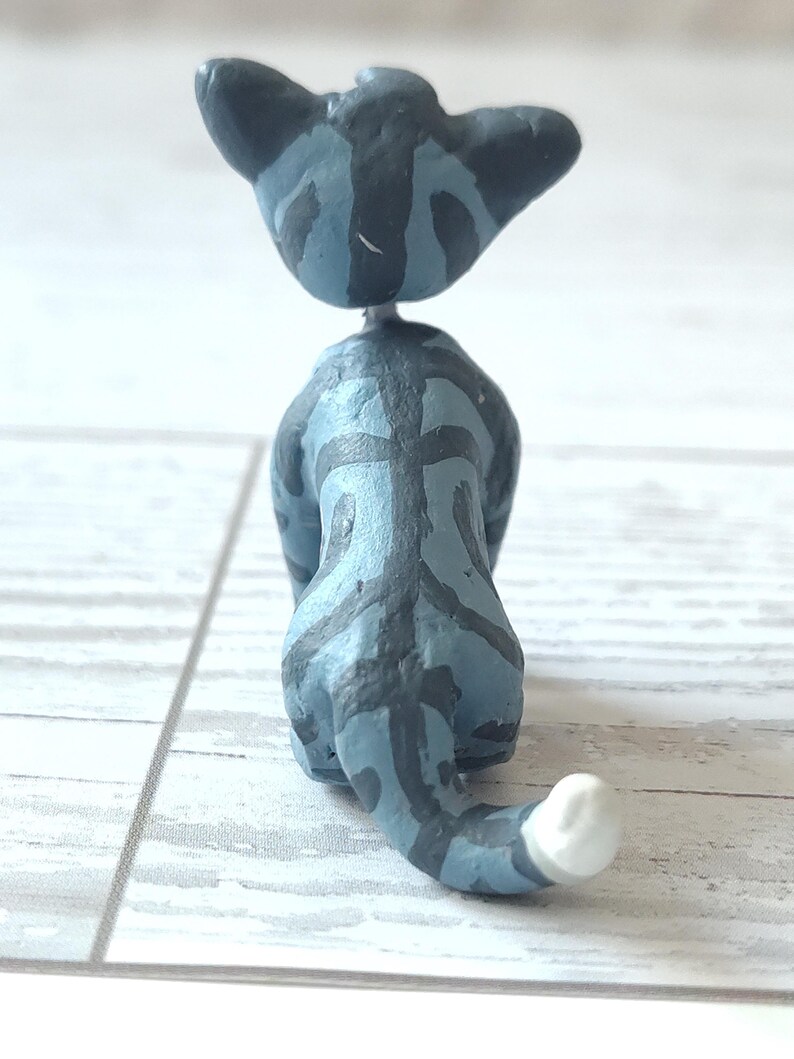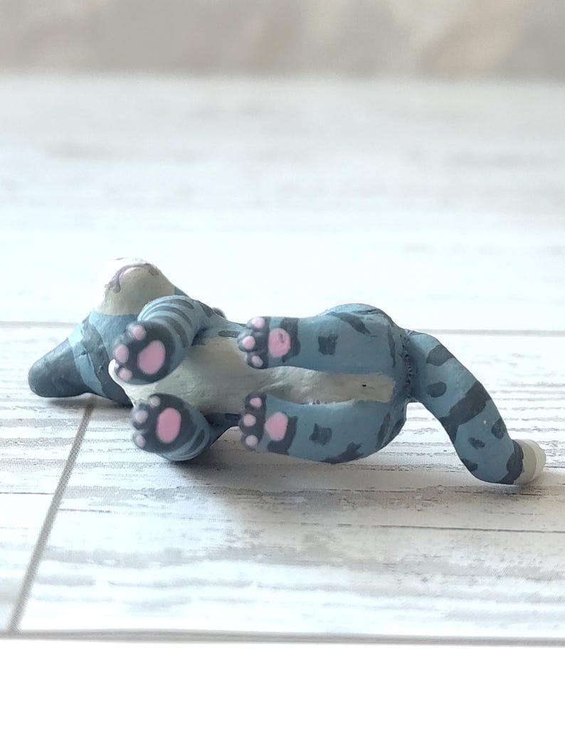 This cat is handmade with premium air dry clay, hand painted with acrylic paint, and coated with Mod-Podge. The eyes are coated with glossy mod-podge while the rest of the body is covered by matte mod-podge.