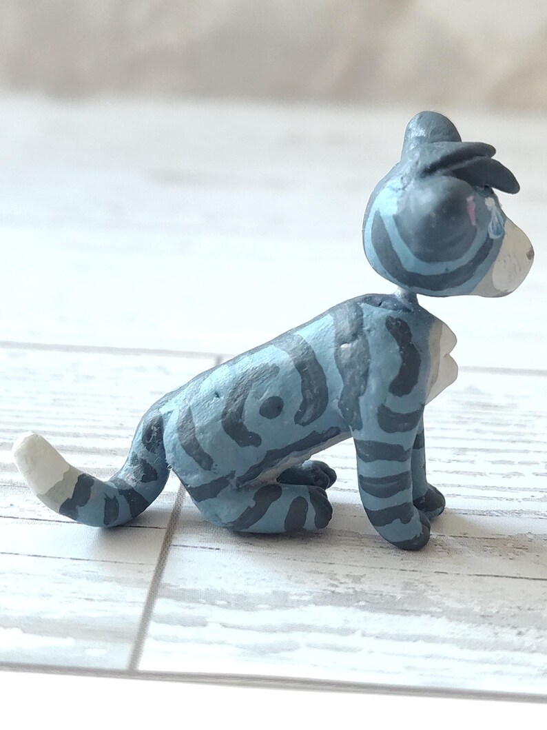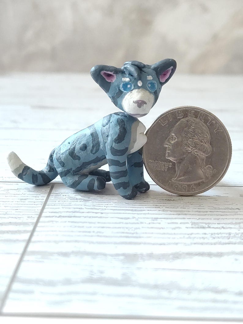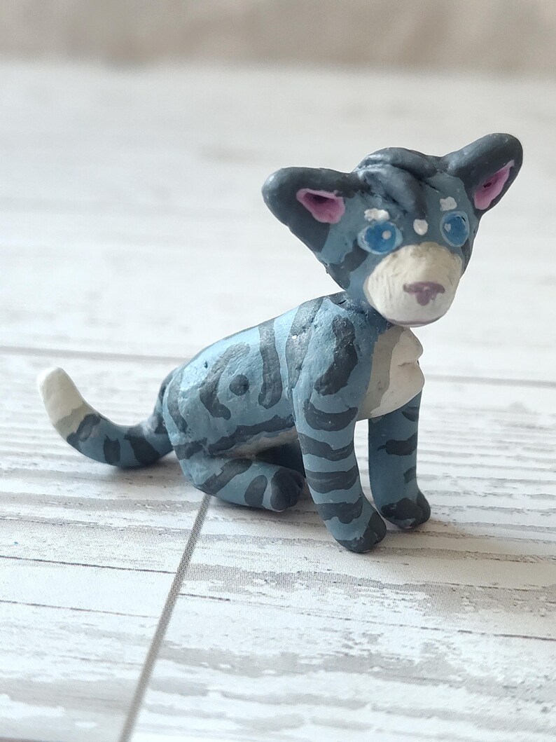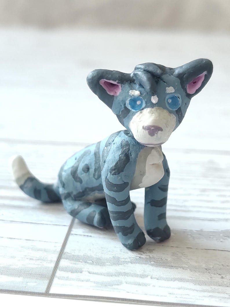 This clay cat is based off of "Jayfeather" from the book series "Warriors" by Erin Hunter. In the books, he was a ThunderClan cat and the son of Leafpool and Crowfeather, although Squirrelflight and Brambleclaw adopted him to protect Leafpool. He was born blind, and trained as a warrior at first, but soon became a medicine cat instead. He is grumpy and rude, but a good medicine cat.