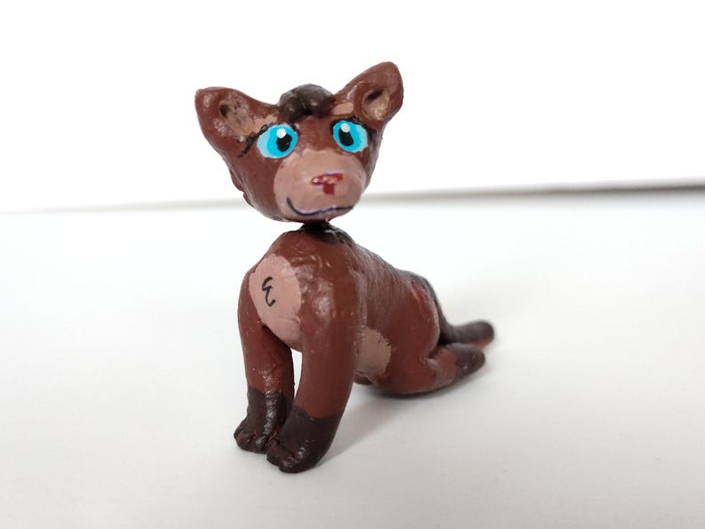 This clay cat is based off of "Briarlight" from the book series "Warriors" by Erin Hunter. In the books, she was a ThunderClan cat and the daughter of Graystripe and Millie. As an apprentice, she was injured in her back legs and spine and was unable to fully walk again. She was sweet and determined, despite her injuries, and a great friend to Jayfeather.
