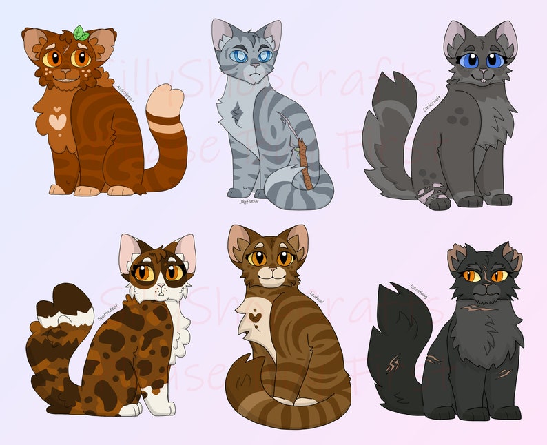 The characters are: Alderheart, Jayfeather, Cinderpelt, Spottedleaf, Leafpool, and Yellowfang. They are all canon characters from Erin Hunter's book series, WARRIORS.
