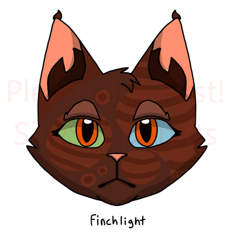 The characters are: Nightheart/Flamepaw, Finchlight, Frostpaw/Frostdawn, Sunbeam, Curlfeather, Blazefire, Mistystar, Reedwhisker, Fidgetflake.