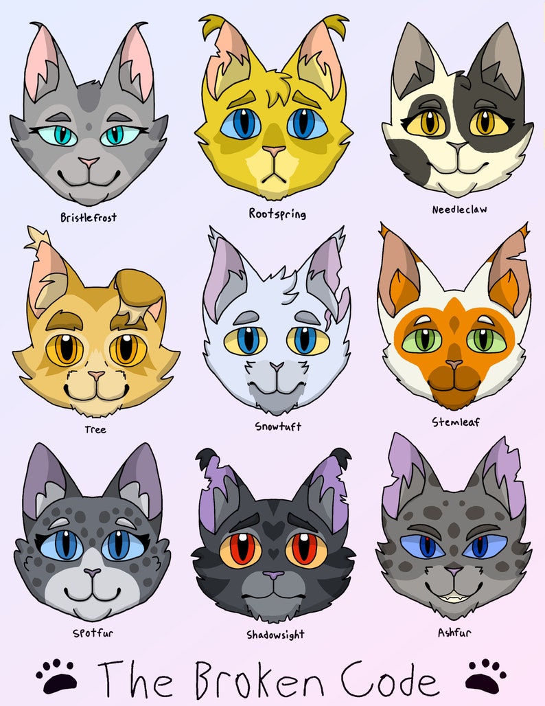 The Broken Code - Bristlefrost, Rootspring, Needleclaw, Tree, Snowtuft, Stemleaf, Spotfur, Shadowsight, and Ashfur.