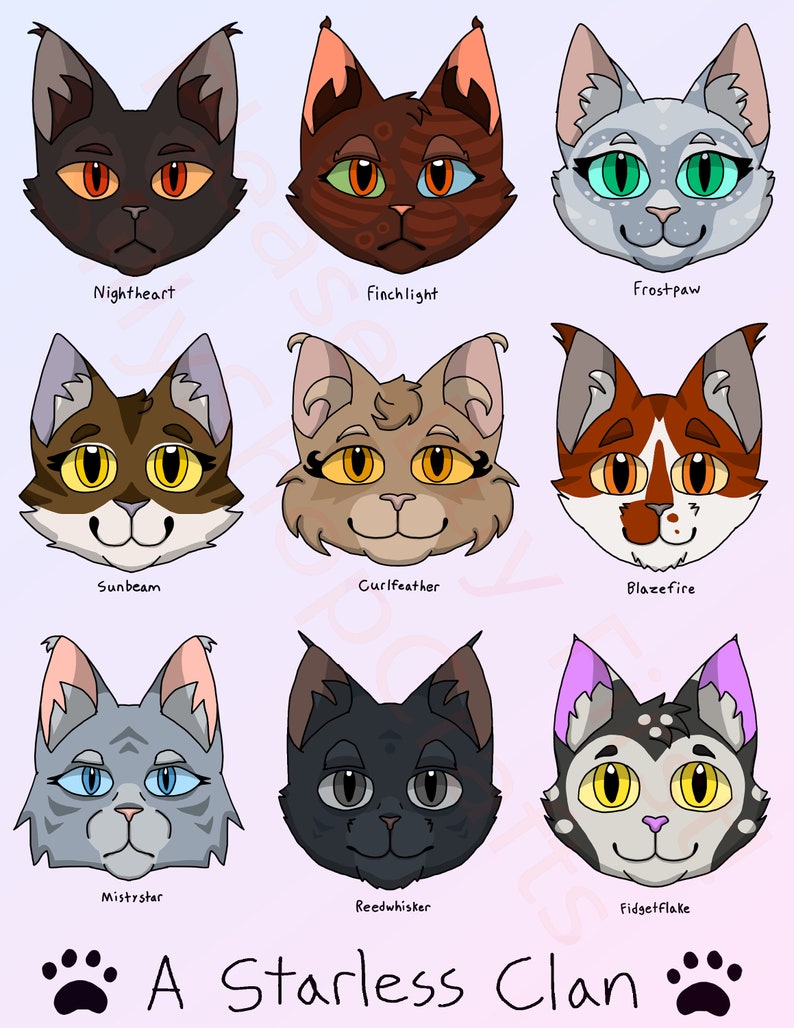 A Starless Clan - Nightheart, Finchlight, Frostpaw, Sunbeam, Curlfeather, Blazefire, Mistystar, Reedwhisker, and Fidgetflake.