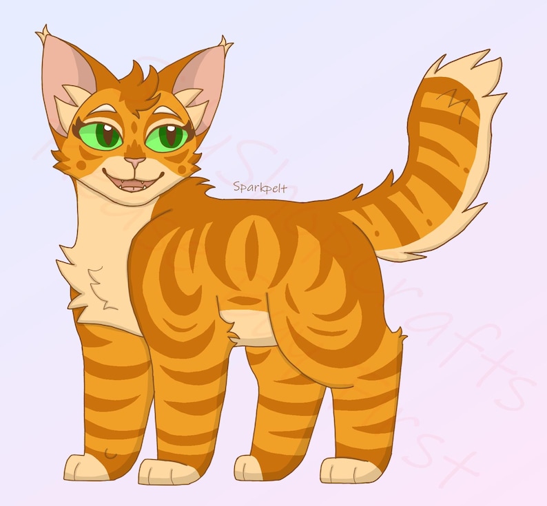 The characters are: Sparkpelt, Tawnypelt, Ivypool, Leopardstar. They are all canon characters from Erin Hunter's book series, WARRIORS.