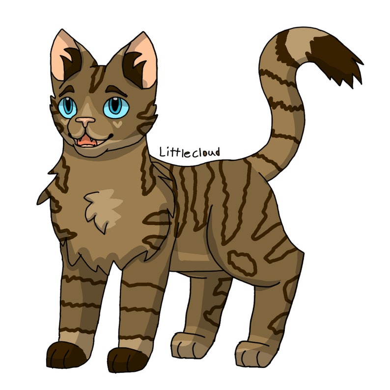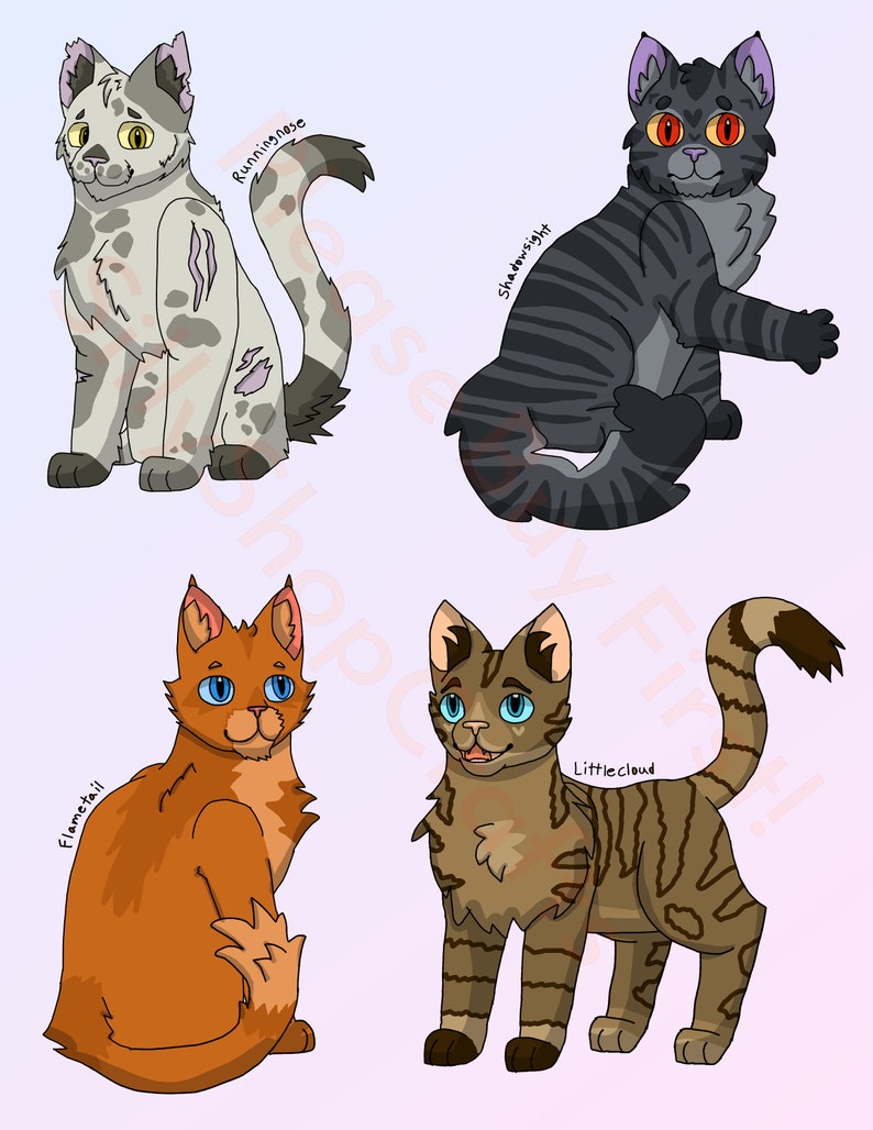 The characters are: Runningnose, Shadowsight, Flametail, and Littlecloud . They are all canon characters from Erin Hunter's book series, WARRIORS.