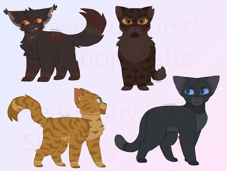 The characters are: Nightheart, Dustpelt, Thornclaw, Crowfeather. They are all canon characters from Erin Hunter's book series, WARRIORS.