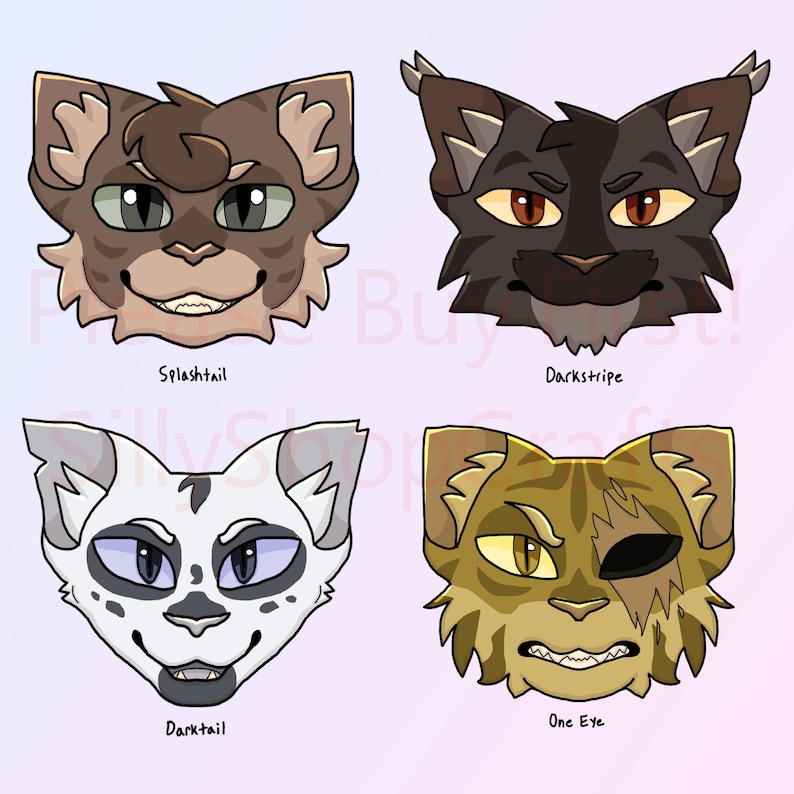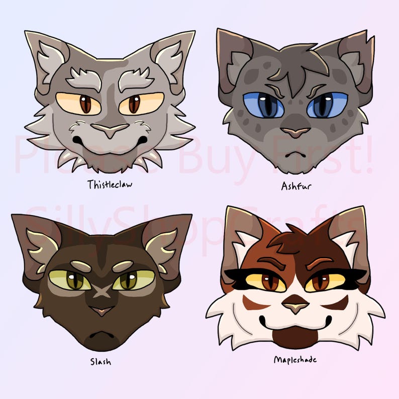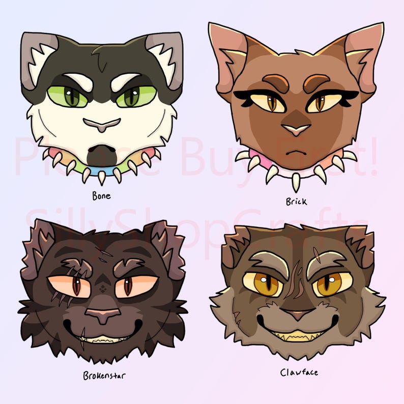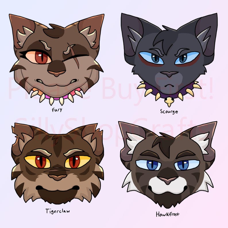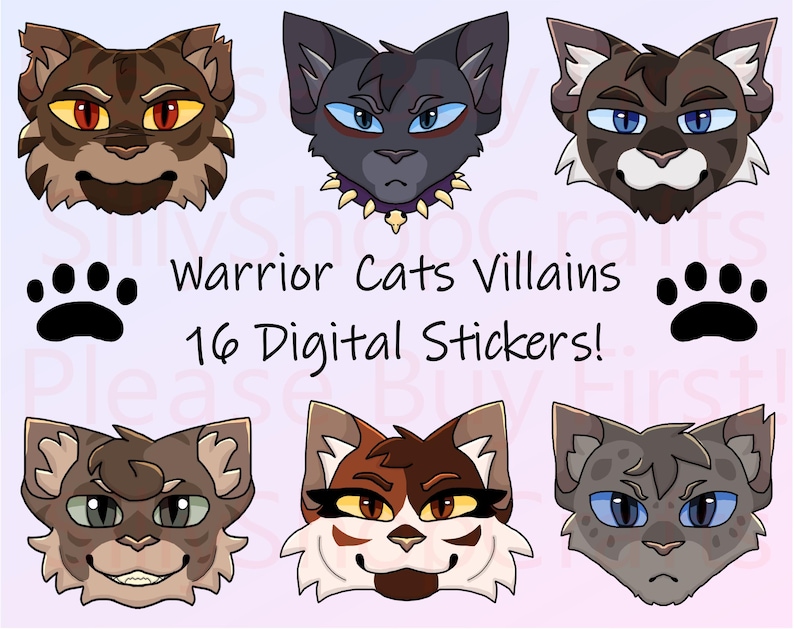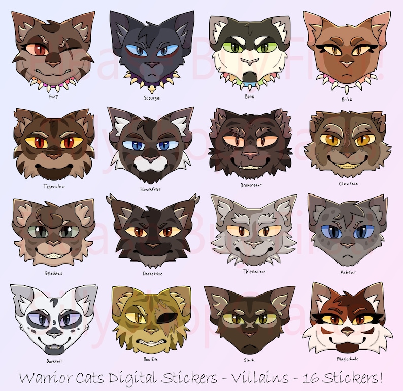 The characters are (in order from left to right, moving down): Fury, Scourge, Bone, Brick, Tigerclaw, Hawkfrost, Brokenstar, Clawface, Splashtail, Darkstripe, Thistleclaw, Ashfur, Darktail, One Eye, Splash, Mapleshade. They are all canon characters from Erin Hunter's book series, WARRIORS.