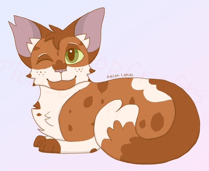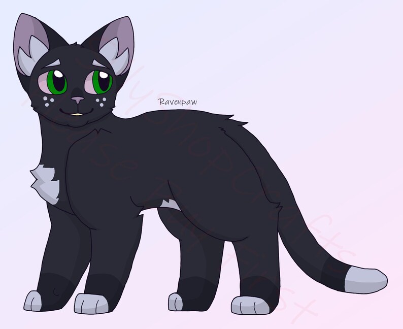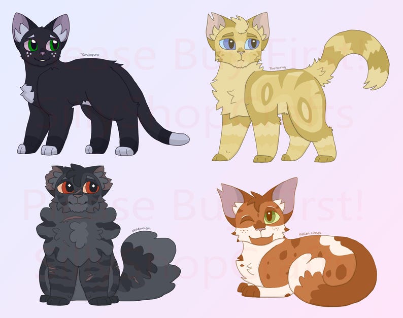 The characters are: Ravenpaw, Rootspring, Shadowsight, Fallen Leaves. They are all canon characters from Erin Hunter's book series, WARRIORS.