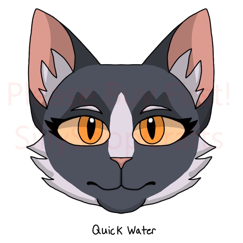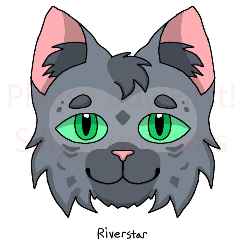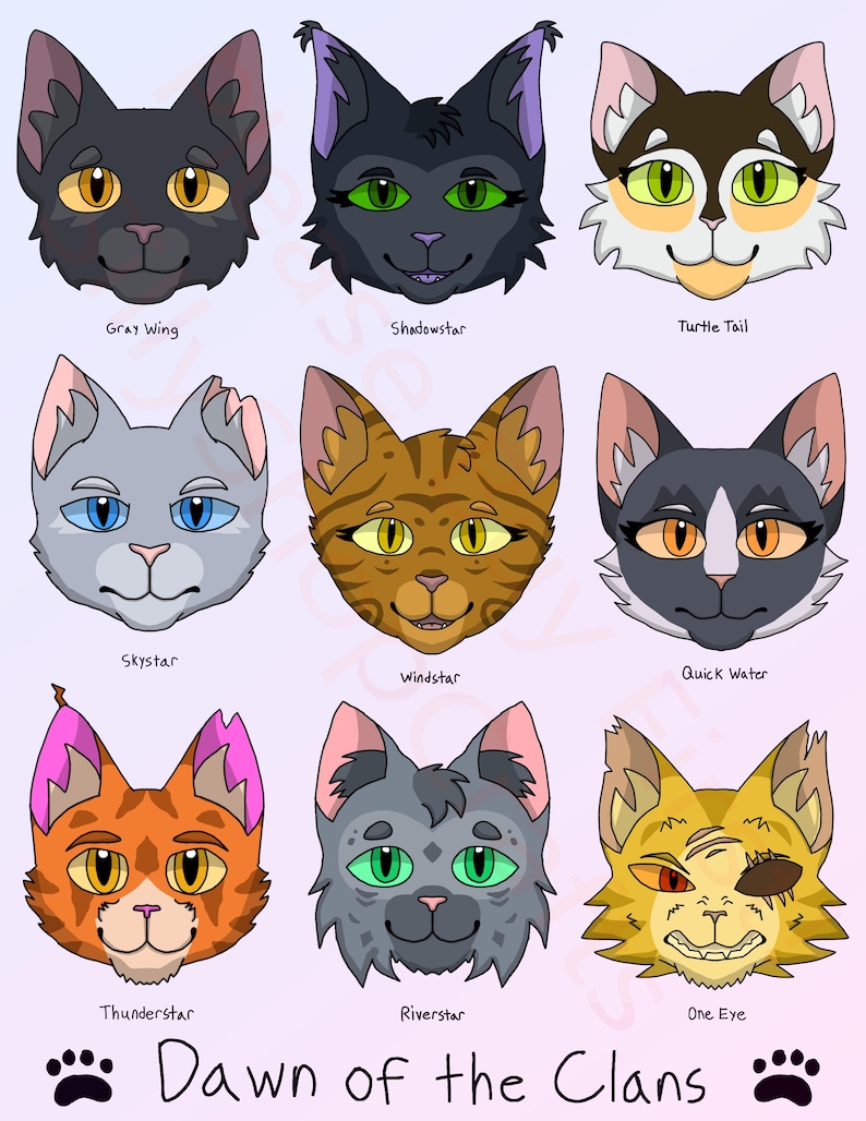 The characters are: Gray Wing, Shadowstar (Tall Shadow), Turtle Tail, Skystar (Clear Sky), Windstar (Wind Runner), Quick Water, Thunderstar (Thunder), Riverstar (River Ripple), and One Eye. They are all canon characters from Erin Hunter's book series, WARRIORS.