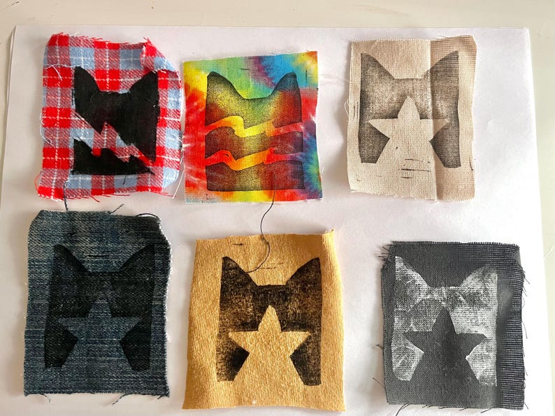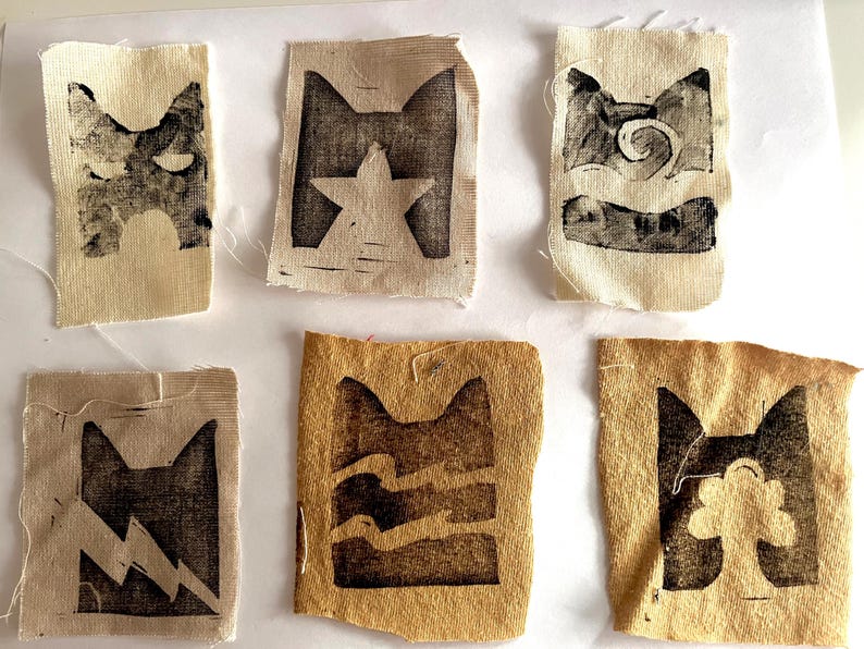 Patches are stamped from hand carved stamps onto hand prepped fabric.