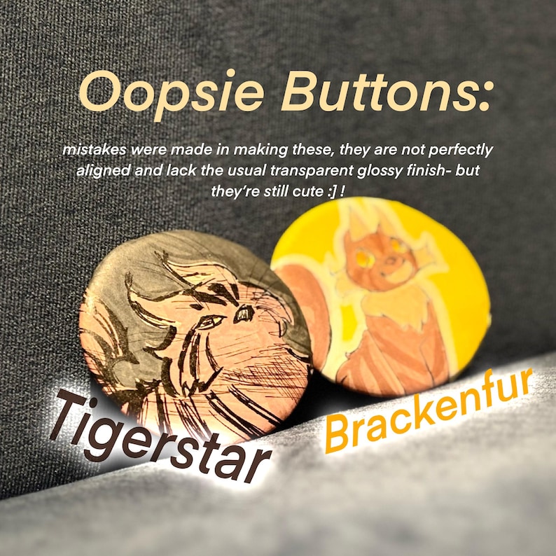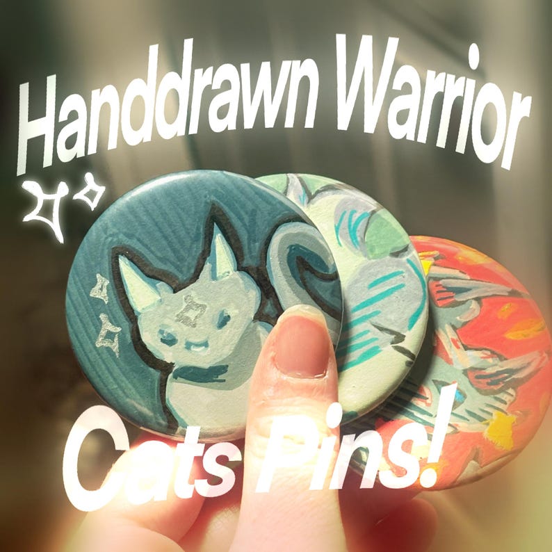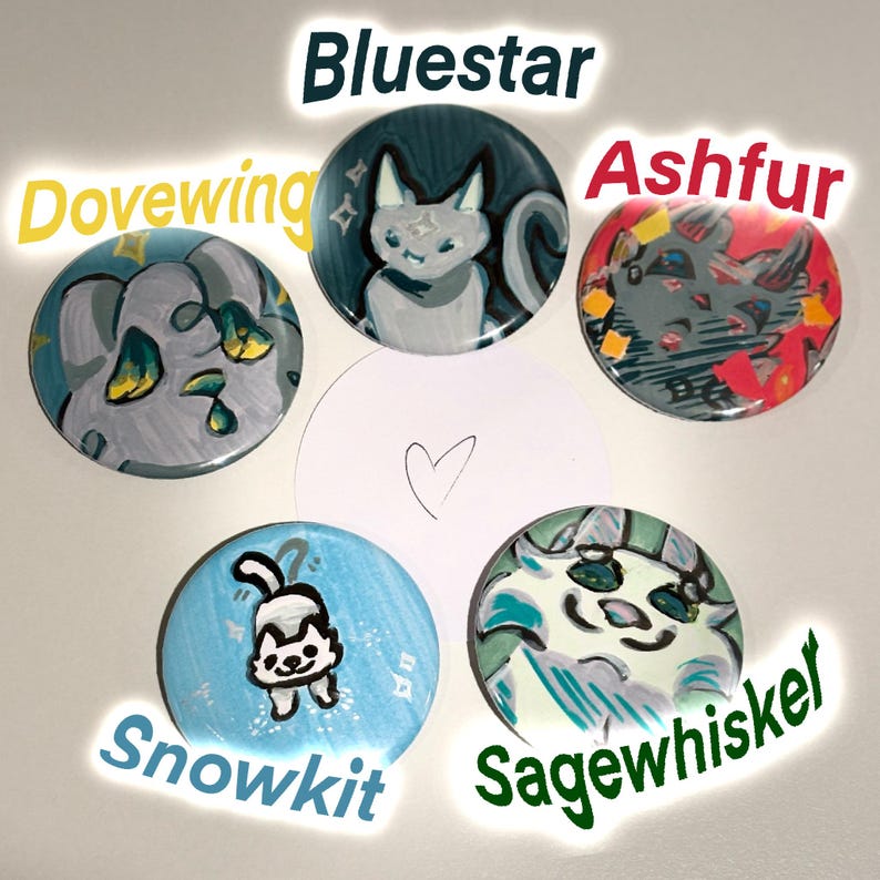 I hand drew/painted some of the warrior cats characters, and used a button machine to make them wearable! ( ˶ˆᗜˆ˵ ) These are just the first few I’ve made, feel free to name another character !!