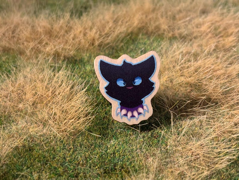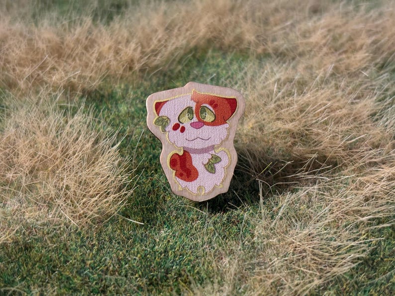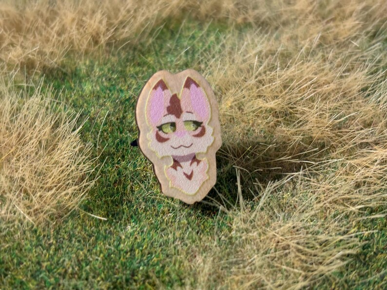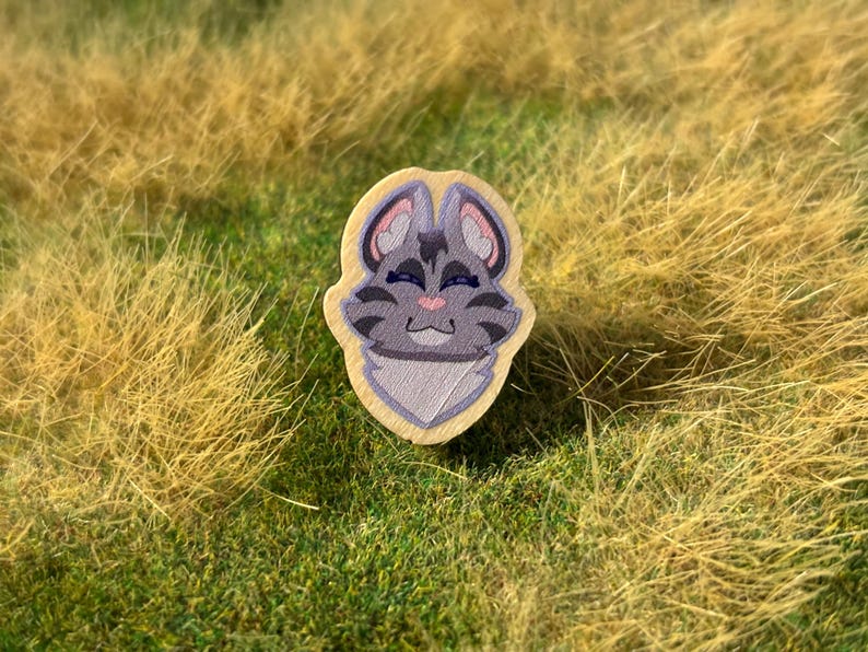 All of the pins are printed wood pins with rubber backs. Each cat will come on a backing card with their clan insignia.