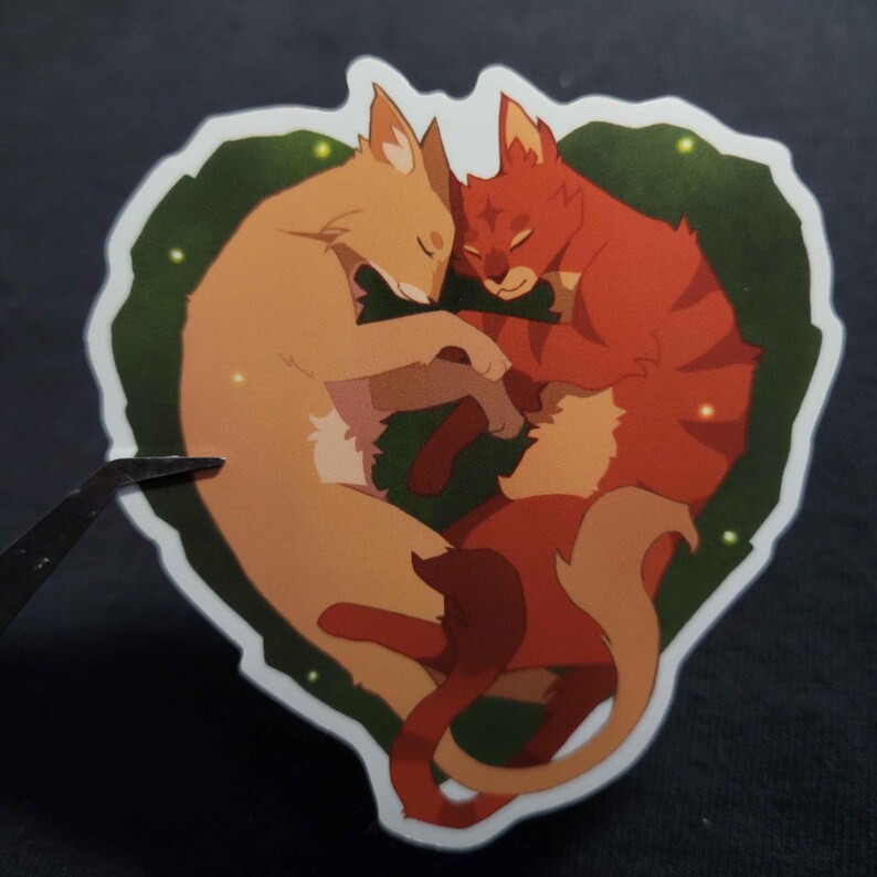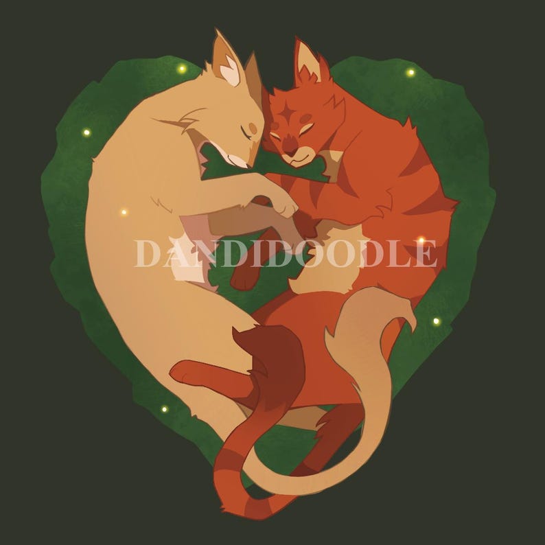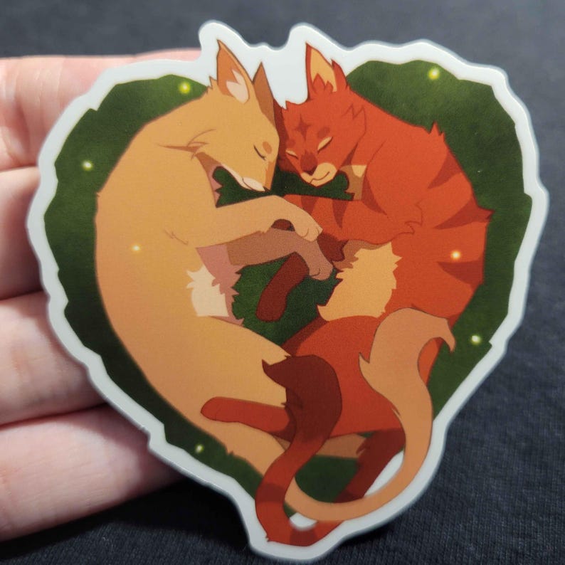 A 3" glossy vinyl sticker of Firestar and Sandstorm sharing a well-deserved rest, after countless books of clan fighting and drama :3