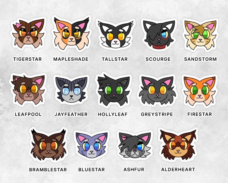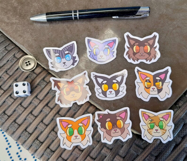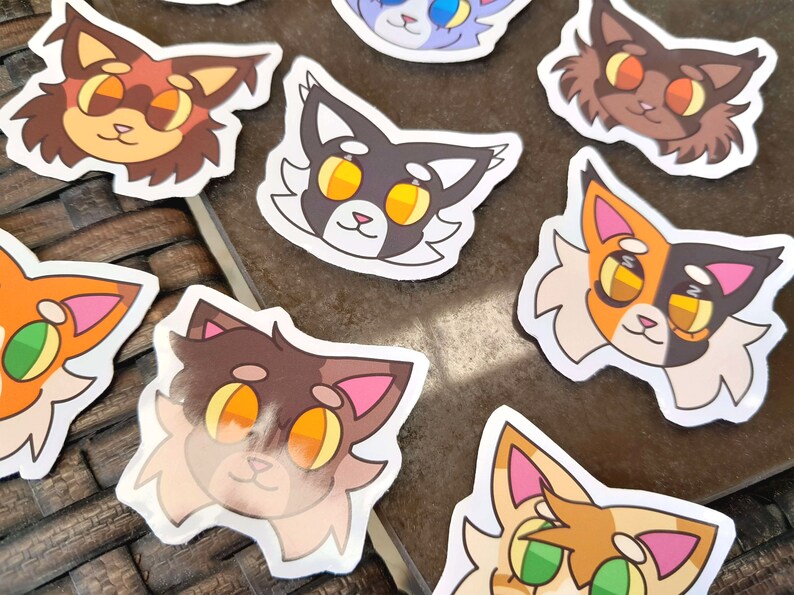 Stickers of iconic Warrior Cats characters! These stickers were designed by my brother, and all proceeds go to him :)