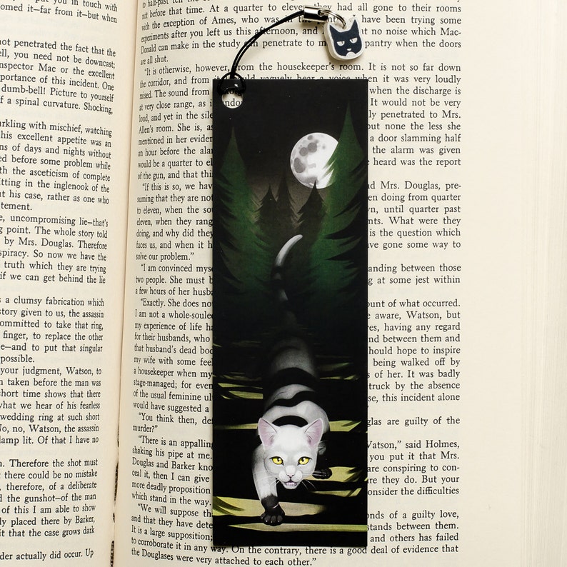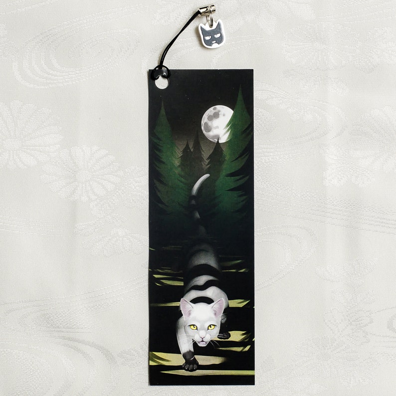 Matte 2x6 inch bookmark on thick 14pt paper, featuring a 0.5 inch glossy charm cut from metallic acrylic. This bookmark features Blackstar. A perfect addition to any Warriors collection!