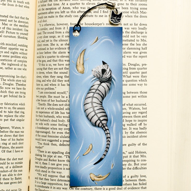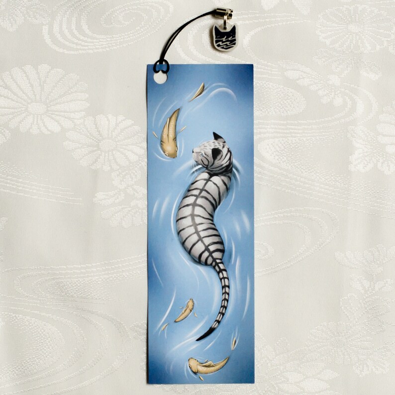 Matte 2x6 inch bookmark on thick 14pt paper, featuring a 0.5 inch glossy charm cut from metallic acrylic. This bookmark features Silverstream. A perfect addition to any Warriors collection!