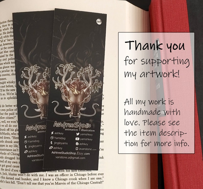 Illustrations are by me, the shop owner. As standard practice, on the back of the bookmark I have my artist logo and socials. The benevolent qilin represents protection and luck - you can view it as a good luck charm. ☺