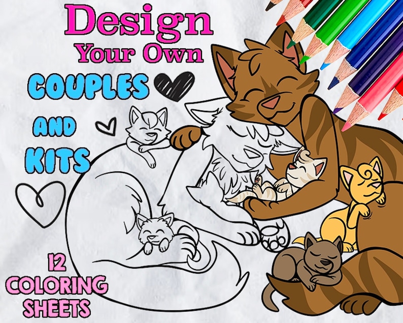 This Coloring Book includes 12 different coloring pages of couples and their kittens: